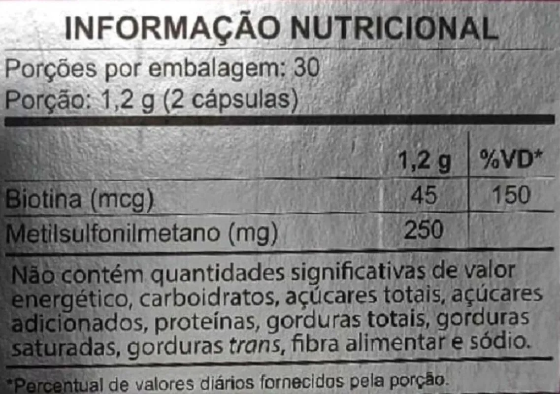 Ingredientes: Metilsulfonilmetano (MSM), D-biotina, antiumectantes selicato de magnésio, estearato de magnésio e dióxido de silício. Composição da cápsula: gelificante gelatina, água purificada, umectante glicerina e corante dióxido de titânio.