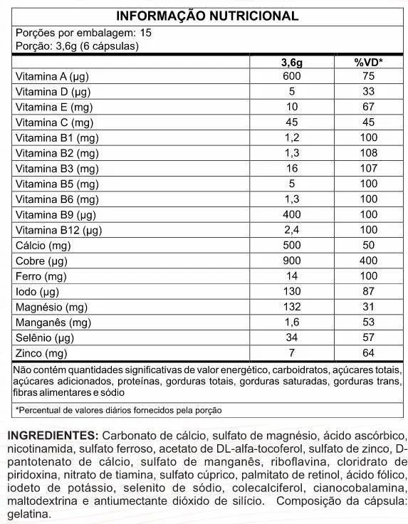 Carbonato de cálcio, sulfato de magnésio, ácido ascórbico, nicotinamida, sulfato ferroso, acetato de DL-alfa tocoferol, sulfato de zinco, D-pantotenato de cálcio, sulfato de manganês, riboflavina, cloridrato de piridoxina, tiamina mononitrato, sulfato cúprico, palmitato de retinol, ácido fólico, iodeto de potássio, selenito de sódio, colecalciferol, cianocobalamina, maltodextrina e antiumectante dióxido de silício. Composição da Cápsula: Gelatina. NÃO CONTÉM GLÚTEN.