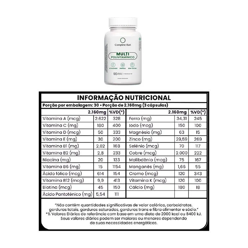 O que é o Complete Bari Multi? Éum polivitamínico de alta concentração e absorção 100% pensado para as necessidades gerais do seu corpo. Com todas as vitaminas na forma ativa e minerais na forma quelada, proporcionando MAIOR ABSORÇÃO e aproveitamento pelo seu corpo, garantindo assim máxima eficiência na suplementação de todos os nutrientes que você precisa para o seu dia a dia.