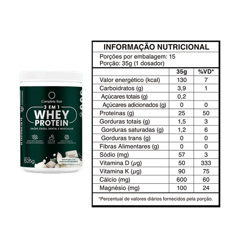 O que é o Complete Bari Whey 3 em 1? É um suplemento proteico a base de whey protein 100% isolado e colágeno hidrolisado (Peptan®) enriquecido com nutrientes importantes a saúde óssea e dental (cálcio, magnésio, vitamina d, vitamina K2), criado com o intuito de facilitar o atingimento da meta proteica diária além de um combo completo extra para os seus ossos e dentes de uma só vez, excluindo a necessidade de suplementação extra para esses fins.