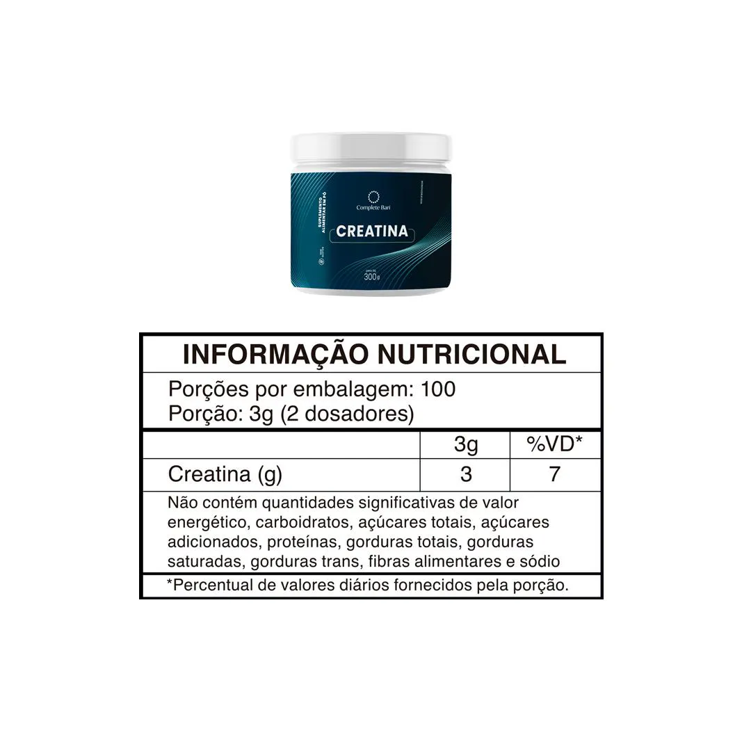 O que é a Complete Bari creatina?Quem busca melhorar o desempenho nas atividades físicas obtendo melhores resultados em algum momento já deve ter ouvido falar da Creatina, um composto de três aminoácidos (glicina, arginina e metionina) 100% pensando para melhores resultados no ganho de massa magra e aumento de energia.Suplementar Creatina é uma forma de fornecer energia para os músculos, melhorando o desempenho físico, aumentando a massa muscular, prevenindo sua perda e a progressão de doenças crônicas, e é por isso que a Complete Bari trouxe mais cuidado especial para a sua saúde.