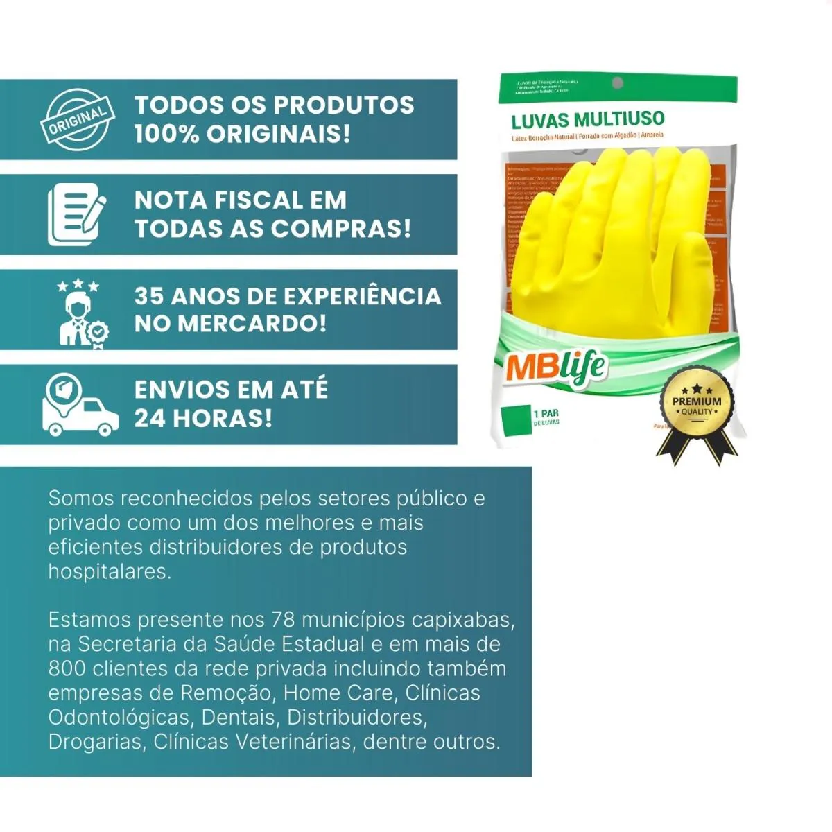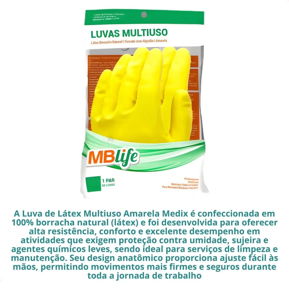 A Luva de Látex Multiuso Amarela Medix é confeccionada em 100% borracha natural (látex) e foi desenvolvida para oferecer alta resistência, conforto e excelente desempenho em atividades que exigem proteção contra umidade, sujeira e agentes químicos leves, sendo ideal para serviços de limpeza e manutenção. Seu design anatômico proporciona ajuste fácil às mãos, permitindo movimentos mais firmes e seguros durante toda a jornada de trabalho. Conta ainda com interior forrado em algodão, que reduz a umidade interna, melhora o conforto térmico e minimiza o desconforto causado pelo suor no uso prolongado. A palma e os dedos texturizados garantem ótima aderência no manuseio de objetos secos, molhados ou escorregadios, tornando o trabalho mais seguro e eficiente.