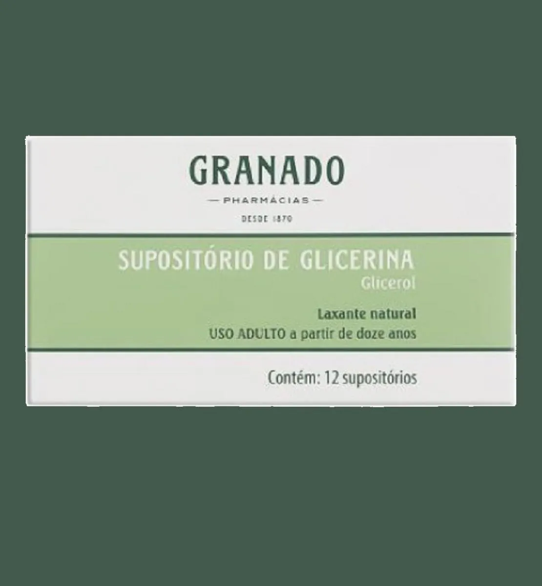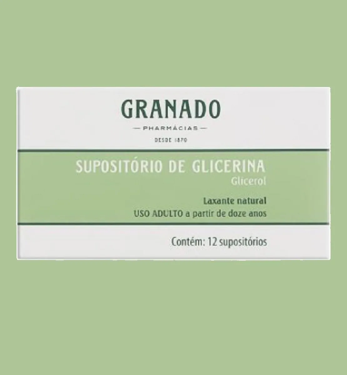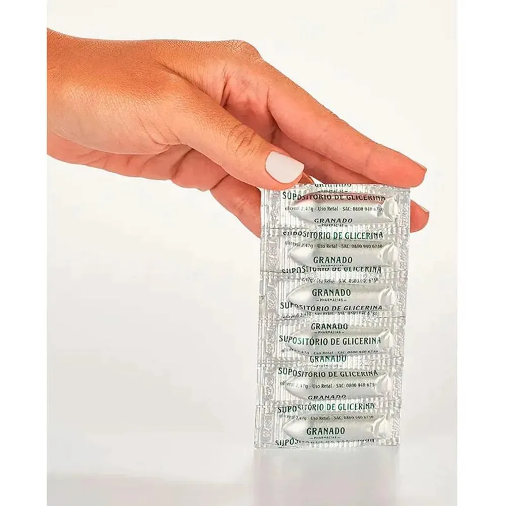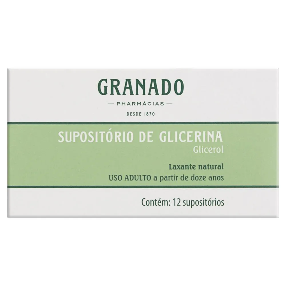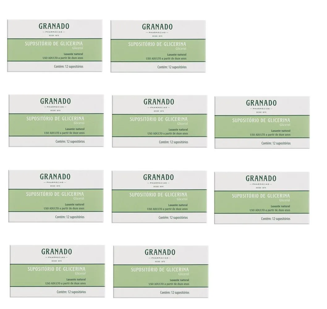 O Supositório de Glicerina da Granado é um medicamento laxante natural de uso retal, composto por glicerol, destinado ao tratamento e prevenção da prisão de ventre. O kit contém 10 unidades com 12 supositórios cada, totalizando 120 unidades, sendo indicado para uso adulto e pediátrico acima de 12 anos.