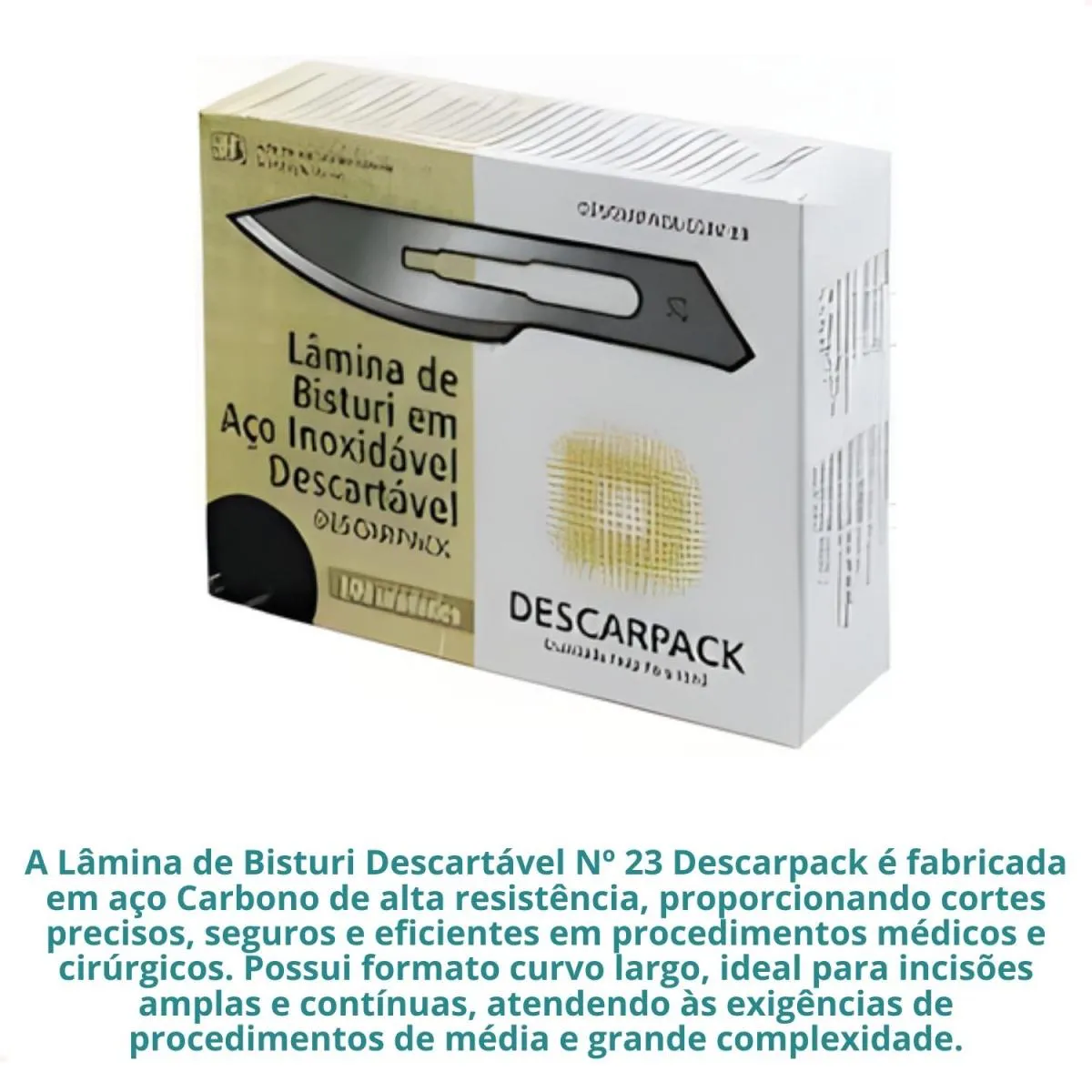 A Lâmina de Bisturi Descartável Nº 23 Descarpack é fabricada em aço Inox de alta resistência, proporcionando cortes precisos, seguros e eficientes em procedimentos médicos e cirúrgicos. Possui formato curvo largo, ideal para incisões amplas e contínuas, atendendo às exigências de procedimentos de média e grande complexidade.