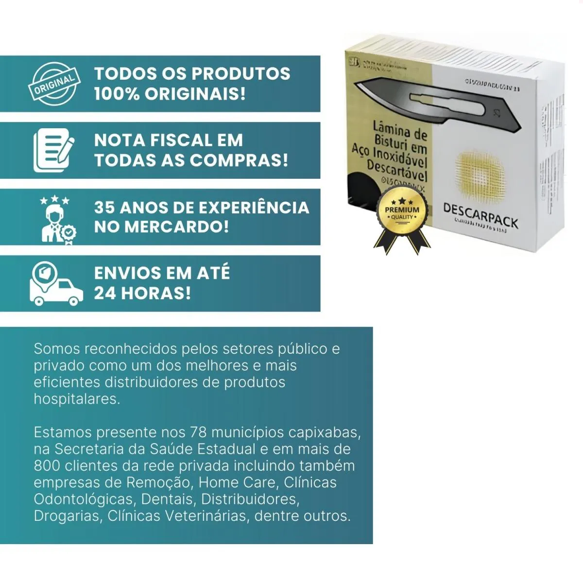 Desde 1990 atuamos com foco em licitações públicas para atendimento a hospitais e clínicas médicas do Espírito Santo. Somos reconhecidos pelos setores público e privado como um dos mais eficientes distribuidores de produtos hospitalares, estando presentes nos 78 municípios capixabas, na Secretaria da Saúde Estadual e em mais de 800 clientes da rede privada, incluindo empresas de Remoção, Home Care, Clínicas Odontológicas, Dentais, Distribuidores, Drogarias e Clínicas Veterinárias.