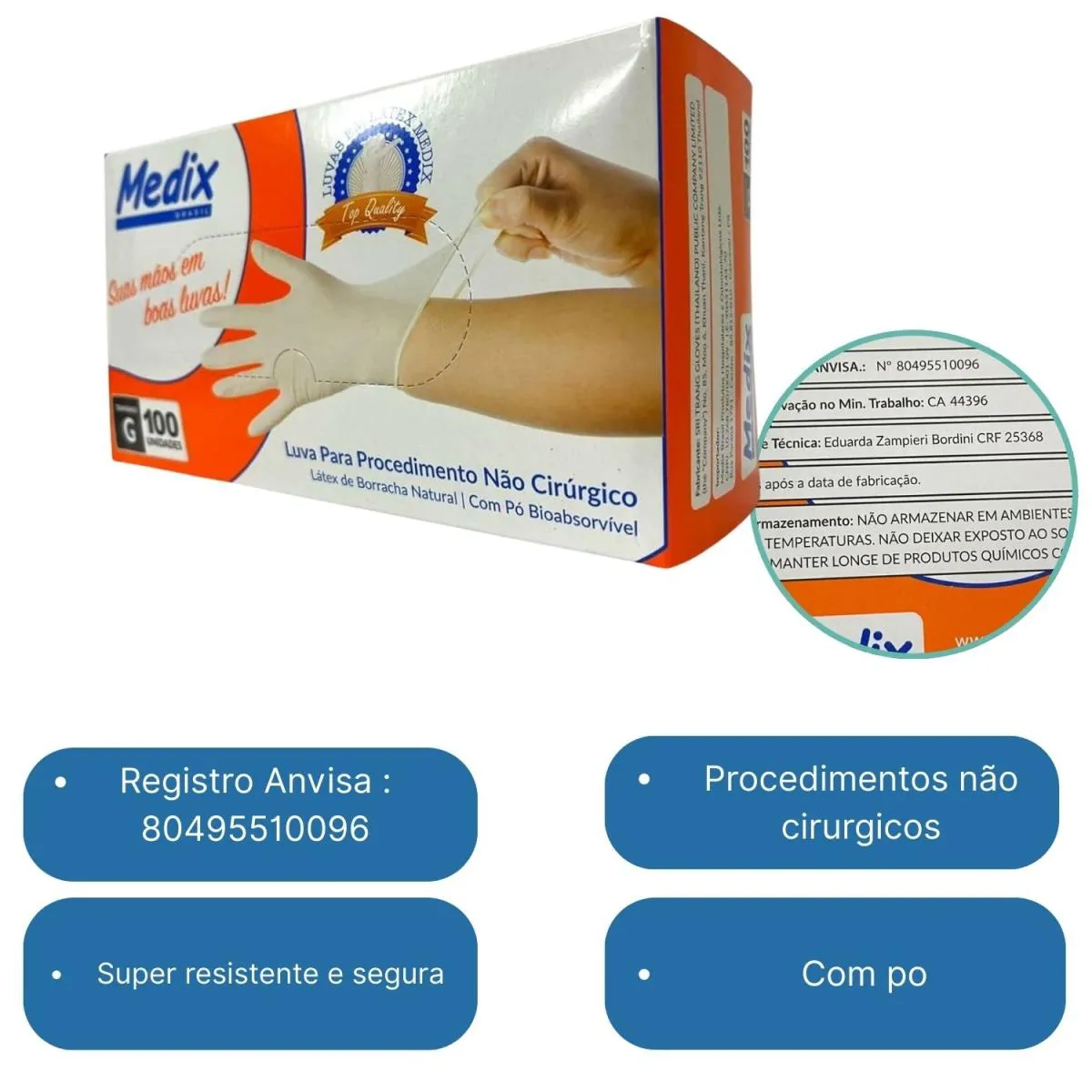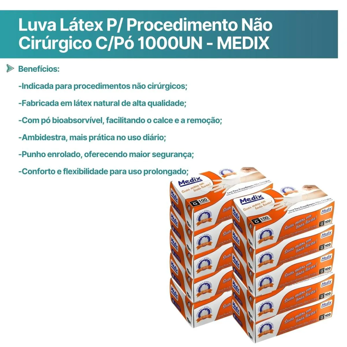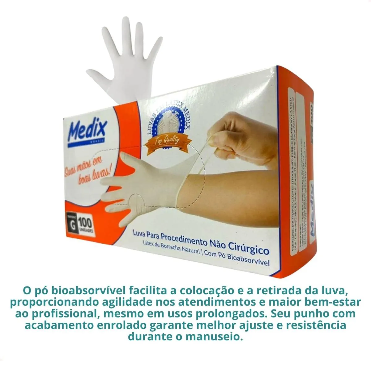 - Facilidade de uso devido ao pó bioabsorvível, que agiliza a colocação e remoção da luva.