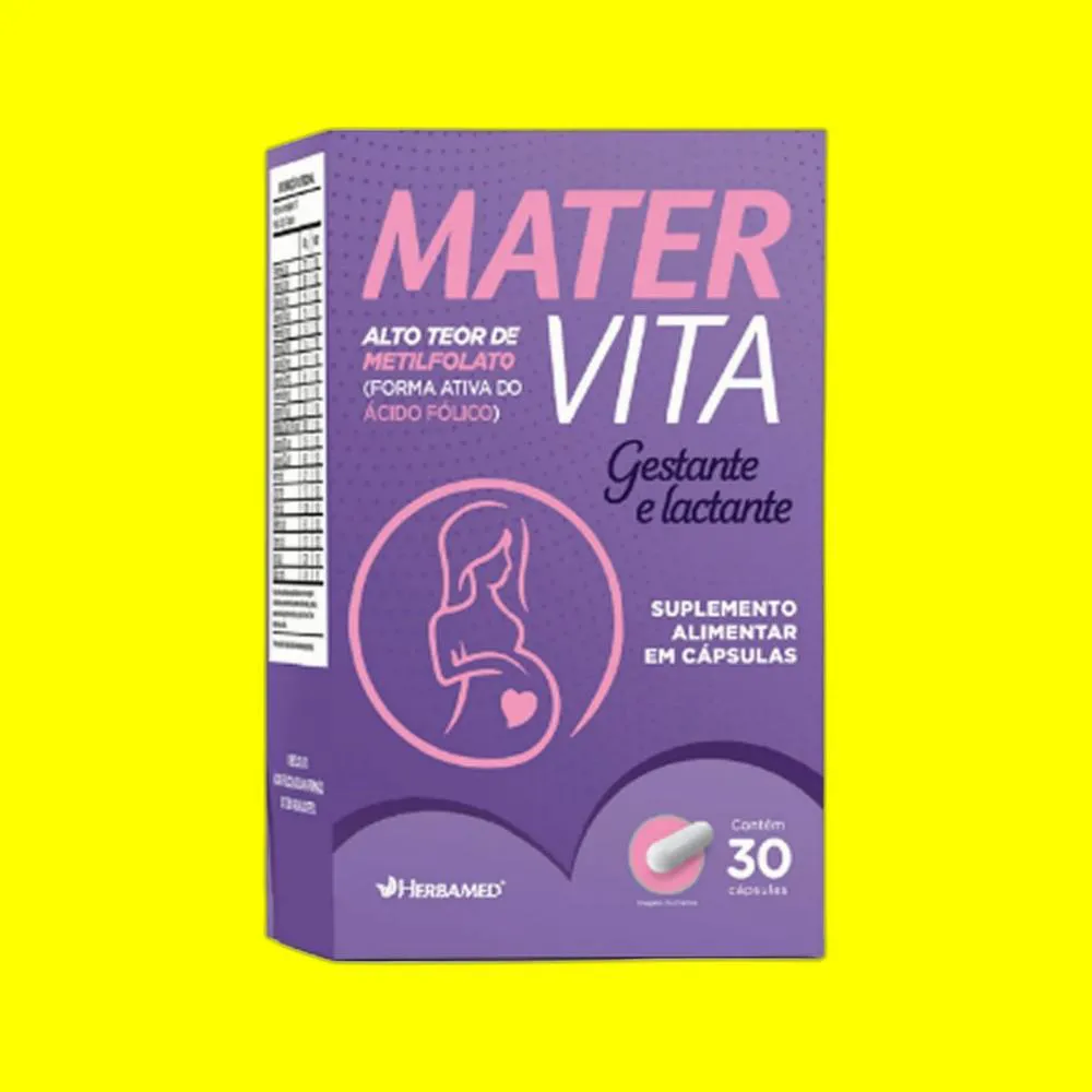 Kit 10x vitamina Matervita 30 cps - HERBAMED   Conteúdo: 30 cápsulas cada unidade.   Porção: 1 cápsula (0,5?g)   Sabor: Sem sabor   Aroma: Sem aroma específico   Cor: Sem cor específica   O que é: Suplemento alimentar multivitamínico e mineral, em cápsulas gelatinosas, com formulação voltada para gestantes e lactantes, incluindo vitaminas (A, B1, B2, B3, B5, B6, B7, B9, B12, C, D3, E, K2) e minerais (ferro, zinco, cobre, selênio, cromo, iodo, cálcio).   Uma nutrição equilibrada tem um papel muito importante na qualidade de vida. Com o ritmo acelerado de muitas pessoas, às vezes, é muito difícil prestar atenção a todos os requisitos que o corpo precisa para estar saudável e forte. Neste sentido, os suplementos cumprem a função de complementar a alimentação e colaboram para obter as vitaminas, minerais, proteínas e outros componentes indispensáveis para o correto funcionamento do organismo. Este produto é um suplemento dietético, não é um medicamento. Suplementa ante dietas insuficientes. Consulte seu médico e / ou farmacêutico para melhor efetividade.   Modo de uso: Ingerir 1 cápsula ao dia, preferencialmente próximo às refeições.   Principio ativo: Complexo multivitamínico e mineral (vitaminas A, B1, B2, B3, B5, B6, B7, B9 como metilfolato, B12, C, D3, E, K2; ferro, zinco, cobre, selênio, cromo, iodo, cálcio)   Composição: Vitamina A (acetato de retinol), vitamina c (ácido ascórbico), vitamina e (acetato de DL-alfa-tocoferol), Vitamina D3 (colecalciferol), Vitamina B1 (cloridrato de tiamina), Vitamina B2 (riboflavina), Vitamina B3 (nicotinamida), Vitamina B5 (D-pantotenato de cálcio), Vitamina B6 (cloridrato de piridoxina), Vitamina B7 (D-biotina), Metilfolato de cálcio (vitamina B9), Vitamina B12 (cianocobalamina), Vitamina K2 (menaquinona-7); Ferro (fumarato ferroso), Zinco (óxido de zinco), Cobre (bisglicinato), Selênio (selenito de sódio), Cromo (picolinato), Iodo (iodeto de potássio), Cálcio (carbonato de cálcio); antiumectantes (dióxido de silício coloidal, estearato de magnésio, carbonato de cálcio); cápsula: gelatina, água purificada, glicerina, dióxido de titânio. Não contém glúten.   Observações: Não exceder a recomendação diária indicada na embalagem. Mantenha fora do alcance de crianças. Em caso de irritação, suspender o uso imediatamente e procurar um médico. Evitar o contato com os olhos e mucosas.   Alérgicos: Contém gelatina. Não contém glúten.   Imagens Meramente Ilustrativas. Todas as Informações Divulgadas são de Responsabilidade Exclusiva do Fabricante/fornecedor.