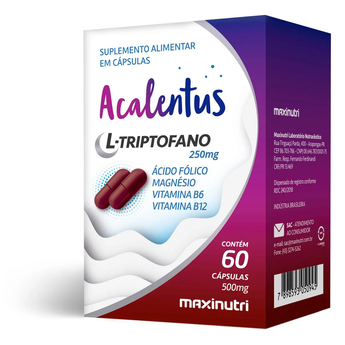 Kit 2 Acalentus L-triptofano Maxinutri 60 Cápsulas O Acalentus L-triptofano da Maxinutri é um suplemento alimentar que contém L-triptofano, um aminoácido essencial que desempenha vários papéis importantes no corpo humano. Aqui estão alguns dos possíveis benefícios associados a este produto: