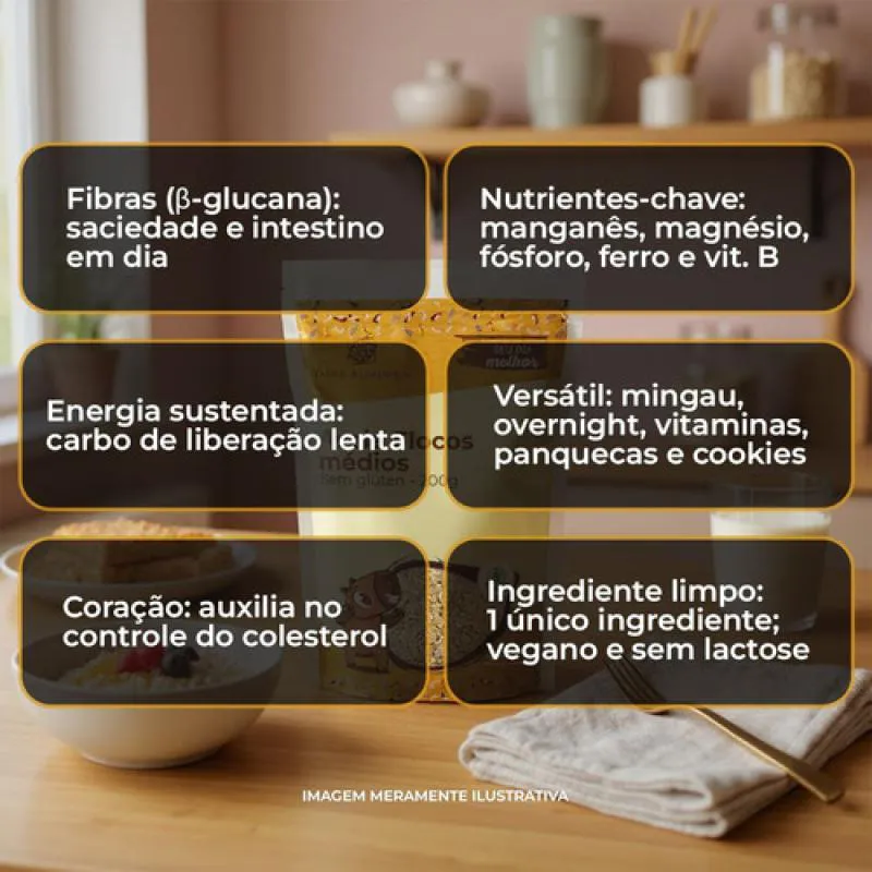 Pronta para o consumo, essa aveia pode ser incorporada em iogurtes, frutas, cereais matinais, biscoitos, pães, e especialmente o clássico mingau. Também pode enriquecer vitaminas, bolos e preparações doces ou salgadas com um toque nutritivo.