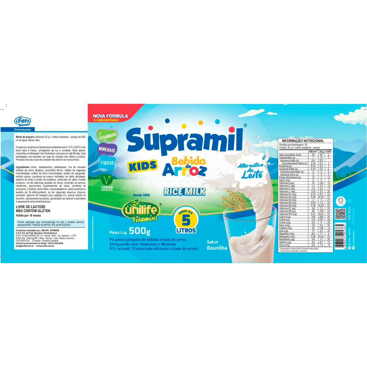SUPRAMIL BEBIDA DE ARROZ KIDS UNILIFE 500G – Suplemento alimentar vegano em pó à base de arroz com vitaminas e minerais. Ingredientes: arroz, maltodextrina, polidextrose, mix de minerais, carbonato de cálcio, fosfato tricálcico, mix de vitaminas, pó de cogumelo Agaricus bisporus com vitamina D2, aroma natural de baunilha, edulcorantes (sucralose, glicosídeos de esteviol, taumatina) e espessante carboximetilcelulose. Autorização: RDC 719/2022 ANVISA, AFE do MS 6.02234-1. Informações adicionais: não contém glúten, livre de lactose.