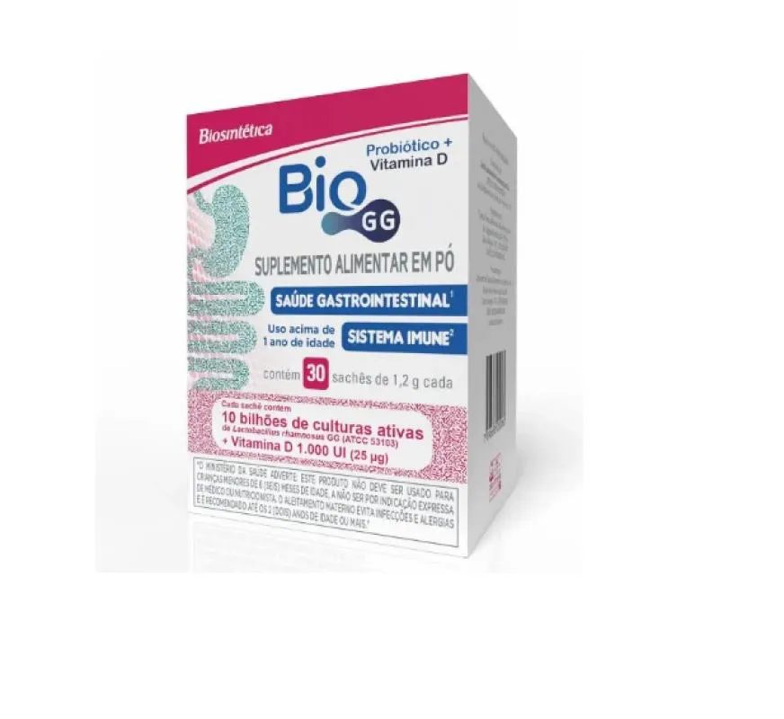 Bio GG Suplemento Alimentar 30 Saches - Biosintética É um produto que combina o probiótico Lactobacillus rhamnosus GG com vitamina D3 para auxiliar na saúde intestinal e no sistema imunológico. Ele é indicado para o equilíbrio da flora intestinal, para o reforço da imunidade, e pode ser usado em casos de diarreia ou constipação, sendo apresentado em pó para solução oral e podendo ser consumido por adultos e crianças conforme orientação médica. Saúde intestinal: A cepa probiótica Lactobacillus rhamnosus GG ajuda a manter o equilíbrio da microbiota intestinal, auxiliando na digestão e absorção de nutrientes. Sistema imunológico: A vitamina D3 presente na fórmula contribui para o bom funcionamento do sistema imune, além de auxiliar na saúde óssea. Ação combinada: A combinação de probiótico com vitamina d oferece benefícios para a saúde gastrointestinal e imunológica. Imagens Meramente Ilustrativas. Todas as Informações Divulgadas são de Responsabilidade Exclusiva do Fabricante/fornecedor.