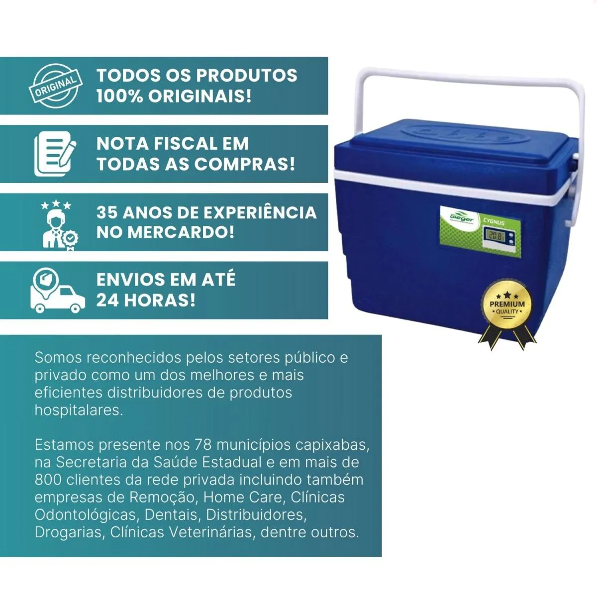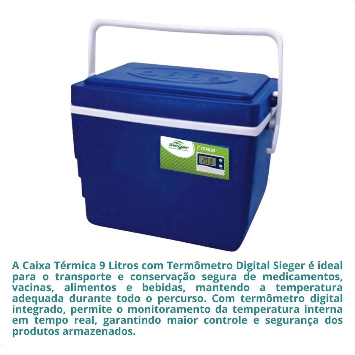 A Caixa Térmica 9 Litros com Termômetro Digital Sieger é ideal para o transporte e conservação segura de medicamentos, vacinas, alimentos e bebidas, mantendo a temperatura adequada durante todo o percurso. Com termômetro digital integrado, permite o monitoramento da temperatura interna em tempo real, garantindo maior controle e segurança dos produtos armazenados. Fabricada com materiais de alta qualidade, como polipropileno resistente e isolante térmico eficiente, proporciona excelente desempenho na conservação térmica. Conta ainda com alça para transporte, design compacto e sistema elétrico que auxilia na manutenção da temperatura desejada, sendo uma solução prática e confiável para uso profissional.