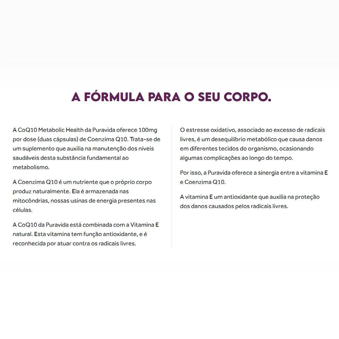 Kit com 2 Suplemento Coenzima Q10 100mg Antioxidante + vitamina e 25mg com 60 Cápsulas – Puravida A CoQ10 Metabolic Health da Puravida oferece 100mg por dose (duas cápsulas) de Coenzima Q10. Trata-se de um suplemento que auxilia na manutenção dos níveis saudáveis desta substância fundamental ao metabolismo. A Coenzima Q10 é um nutriente que o próprio corpo produz naturalmente. Ela é armazenada nas mitocôndrias, nossas usinas de energia presentes nas células A CoQ10 da Puravida está combinada com a vitamina E natural. Esta vitamina tem função antioxidante, e é reconhecida por atuar contra os radicais livres. O estresse oxidativo, associado ao excesso de radicais livres, é um desequilíbrio metabólico que causa danos em diferentes tecidos do organismo, ocasionando algumas complicações ao longo do tempo. Por isso, a Puravida oferece a sinergia entre a vitamina E e Coenzima Q10. MODO DE USO: A sugestão é tomar duas cápsulas de Coenzima Q10 ao dia, ou de acordo com a orientação de um profissional de saúde. COMPOSIÇÃO: Cápsula (gelatina, água purificada, umectante glicerina e corante extrato de urucum), azeite de oliva, coenzima Q10, óleo de coco e D-alfa-tocoferol. ALÉRGICOS: PODE CONTER SOJA, LEITE, PEIXES, OVOS, AMENDOIM, AMÊNDOA, AVELÃS, CASTANHA-DE-CAJU, CASTANHA-DO-PARÁ, MACADÂMIAS, NOZES, PECÃS, PISTACHES, PINOLI, CASTANHAS, CRUSTÁCEOS (KRILL E CARANGUEJO), TRIGO, CENTEIO, CEVADA, AVEIA E SUAS ESTIRPES HIBRIDIZADAS. CONTÉM GLÚTEN. *Não fazem parte da formulação do produto. No entanto, pode haver traços devido ao compartilhamento de equipamento em alguma etapa do processo produtivo. SOBRE A LOJA: Somos a rede de farmácias mais antiga de São José dos Pinhais, atuando no ramo farmacêutico desde 1990 com comprometimento à qualidade e satisfação do cliente. É um prazer compartilhar os nossos valores e as nossas conquistas com quem confia no nosso trabalho! Imagens dos Produtos são Meramente Ilustrativas. Todas as Informações Divulgadas são de Responsabilidade Exclusiva do Fabricante/fornecedor.