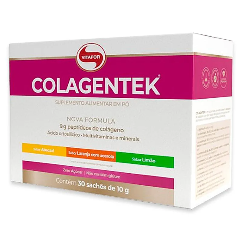 Kit 2 colágeno Hidrolisado Colagentek Vitafor 30 saches Colagentek é um suplemento alimentar em pó à base de peptídeos de colágeno, com zero adição de açúcares e enriquecido com vitaminas e minerais. Diferenciais: - Contém 9,0g de proteína de colágeno por porção.