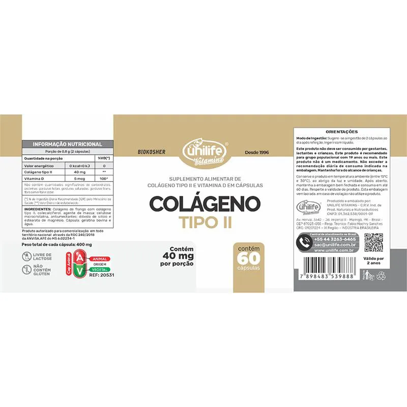 Ingredientes Colágeno de frango com colágeno tipo II, colecalciferol, agente de massa: celulose microcristalina, antiumectantes: dióxido de silício e estearato de magnésio. Cápsula: gelatina bovina e água.