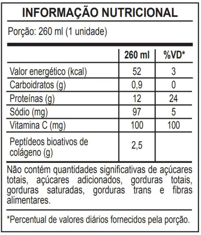Kit 2 Collagen Drink Abacaxi com Hortelã e Limão Nutrify 260ml BENEFÍCIOS: FORTALECIMENTO DA PELE, UNHAS E CABELOS. COLLAGEN DRINK Nutrify é uma bebida refrescante, saborosa e nutritiva. Sua formulação inovadora oferece 2,5 g de peptídeos bioativos de colágeno Verisol®, dose comprovadamente eficaz para a manutenção da saúde da pele, além de alto teor de vitamina c, que auxilia na síntese de colágeno, na proteção dos danos causados pelos radicais livres e no funcionamento do sistema imune. NUTRIFY valoriza a origem de cada ingrediente, respeita a integridade de suas fontes naturais e dos envolvidos em sua produção. É assim que criamos produtos saudáveis e saborosos, que fazem bem para as pessoas e para o planeta. Acreditamos que nutrir corpo e mente de modo saudável nos torna capazes de alimentar o mundo com atitudes positivas. INGREDIENTES: Água, colágeno hidrolisado, peptídeos bioativos de colágeno hidrolisado com peso molecular médio de 2kDa (Verisol®), ácido ascórbico, aromatizantes naturais, acidulante ácido cítrico, reguladores de acidez ácido málico (D-, L-) e citrato trissódico, edulcorante glicosídeos de esteviol de Stevia rebaudiana Bertoni e estabilizante goma gelana. NÃO CONTÉM GLÚTEN. CONTÉM AROMATIZANTE. ESTE PRODUTO NÃO É UM MEDICAMENTO. NÃO EXCEDER A RECOMENDAÇÃO DIÁRIA DE CONSUMO INDICADA NA EMBALAGEM. MANTENHA FORA DO ALCANCE DE CRIANÇAS. ESTE PRODUTO É RECOMENDADO PARA ADULTOS A PARTIR DE 19 ANOS. APRESENTAÇÃO: Embalagem disponível: lata contendo suplemento líquido. Sabor abacaxi com hortelã e limão. Peso Líquido: 260 ml Produto classificado como: SUPLEMENTO ALIMENTAR DE PROTEÍNAS LÍQUIDO SABOR DE PINEAPPLE LEMON MINT.