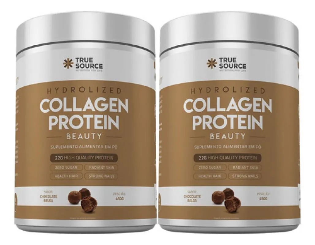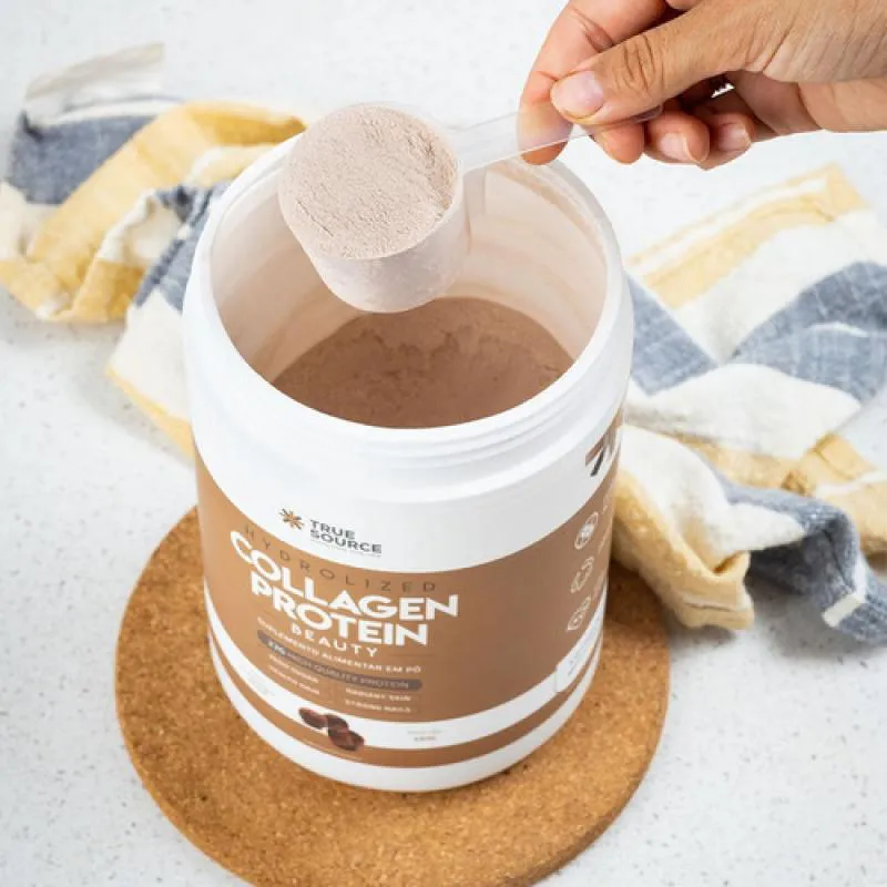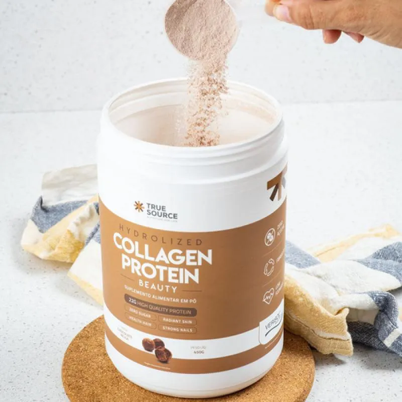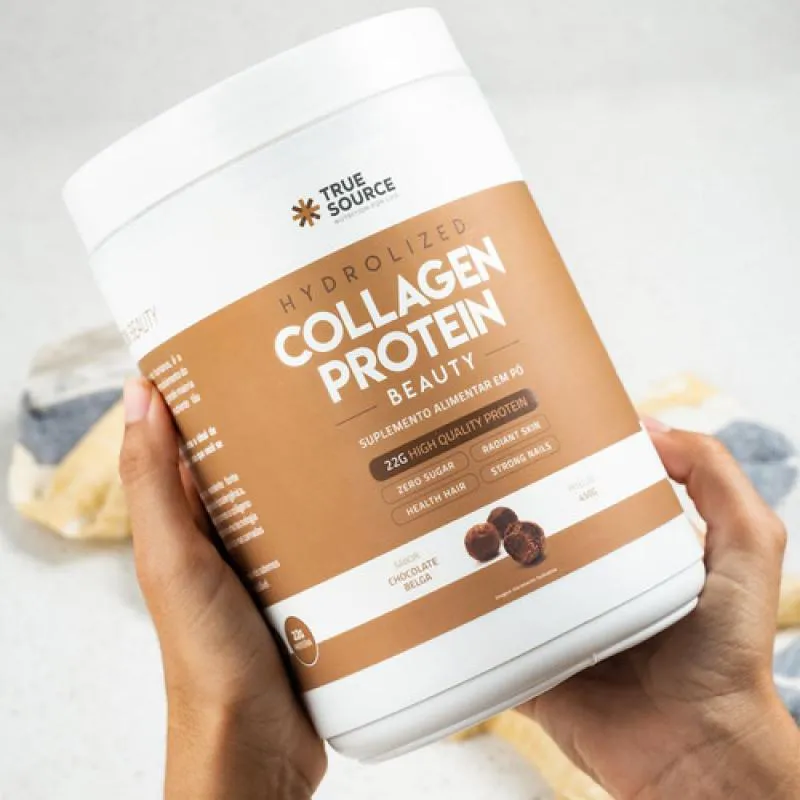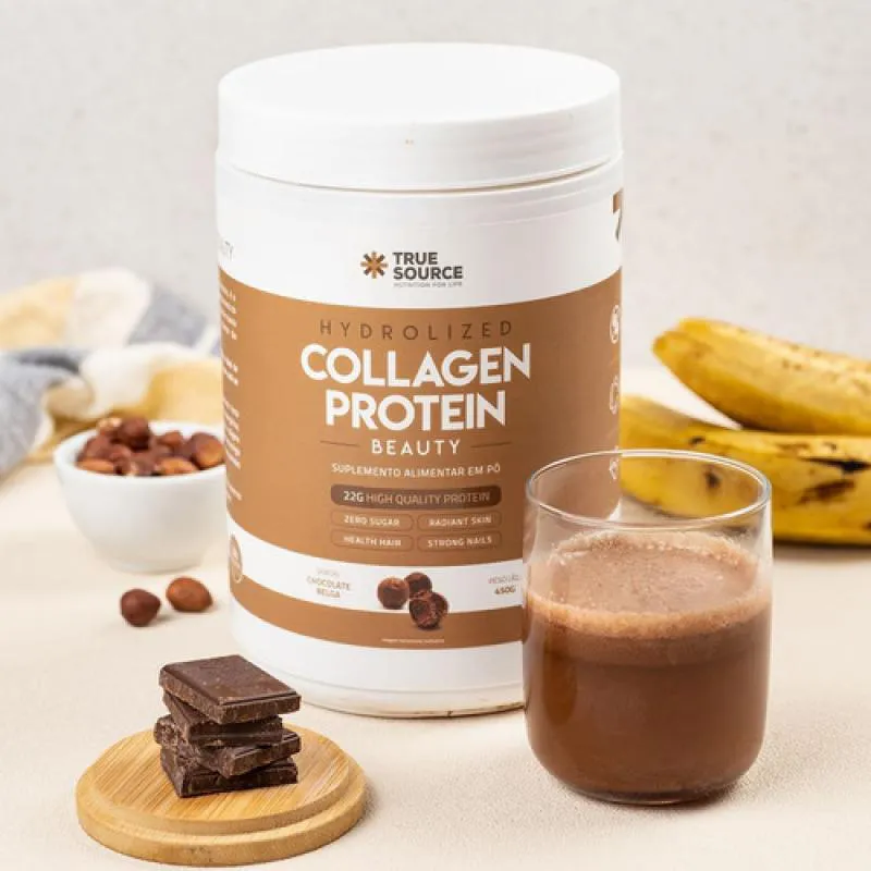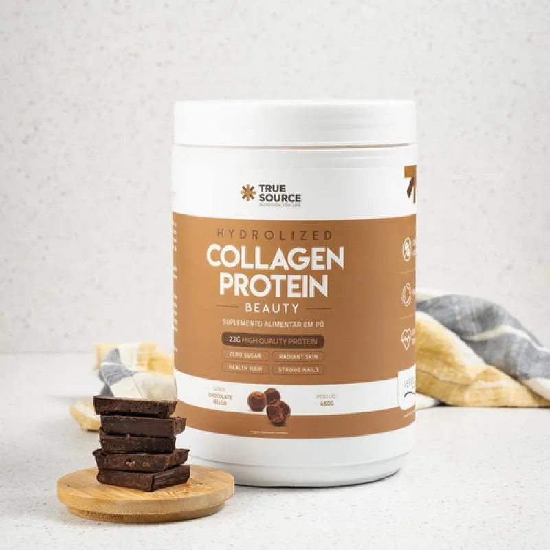 Collagen Protein Chocolate Belga da True Source é um suplemento premium que combina