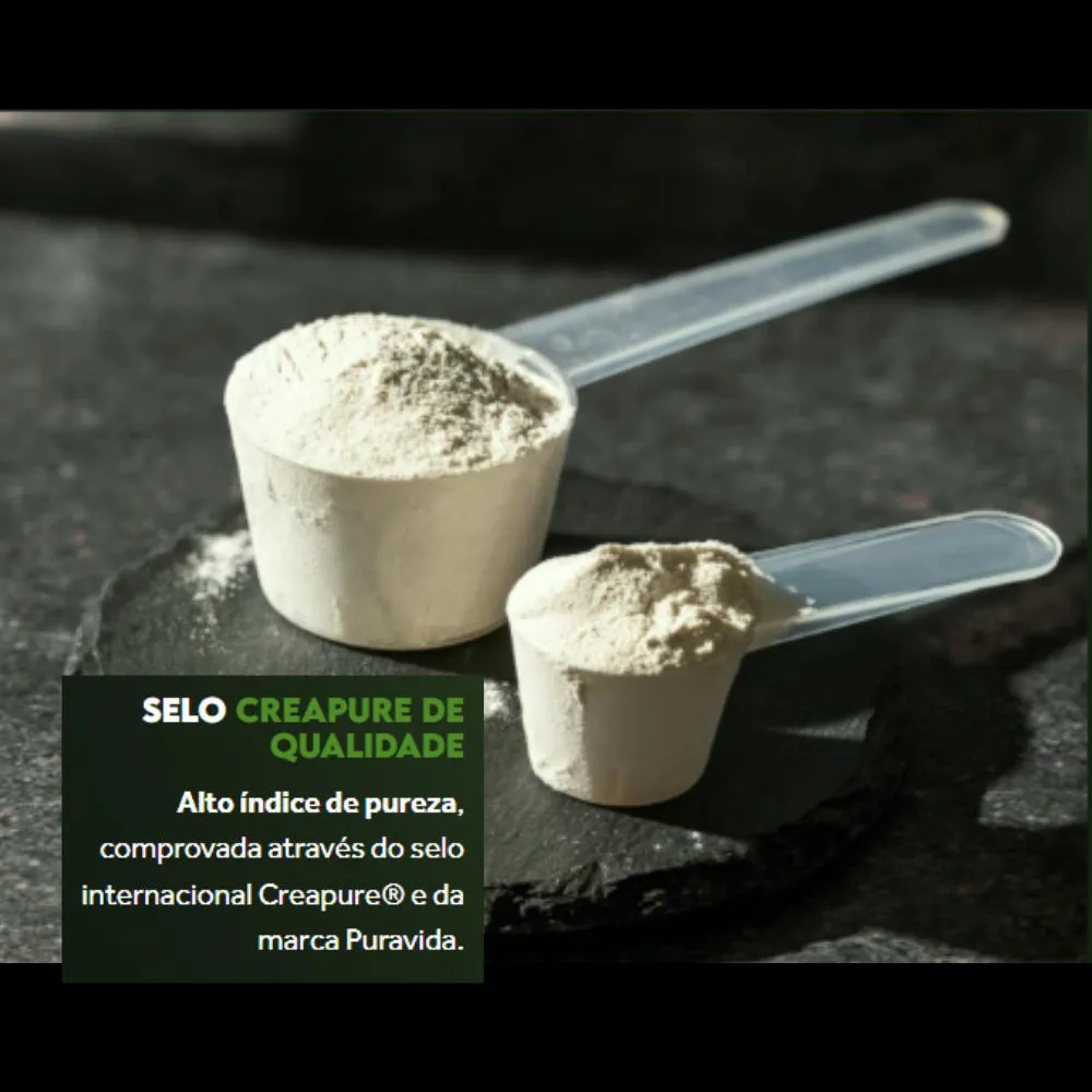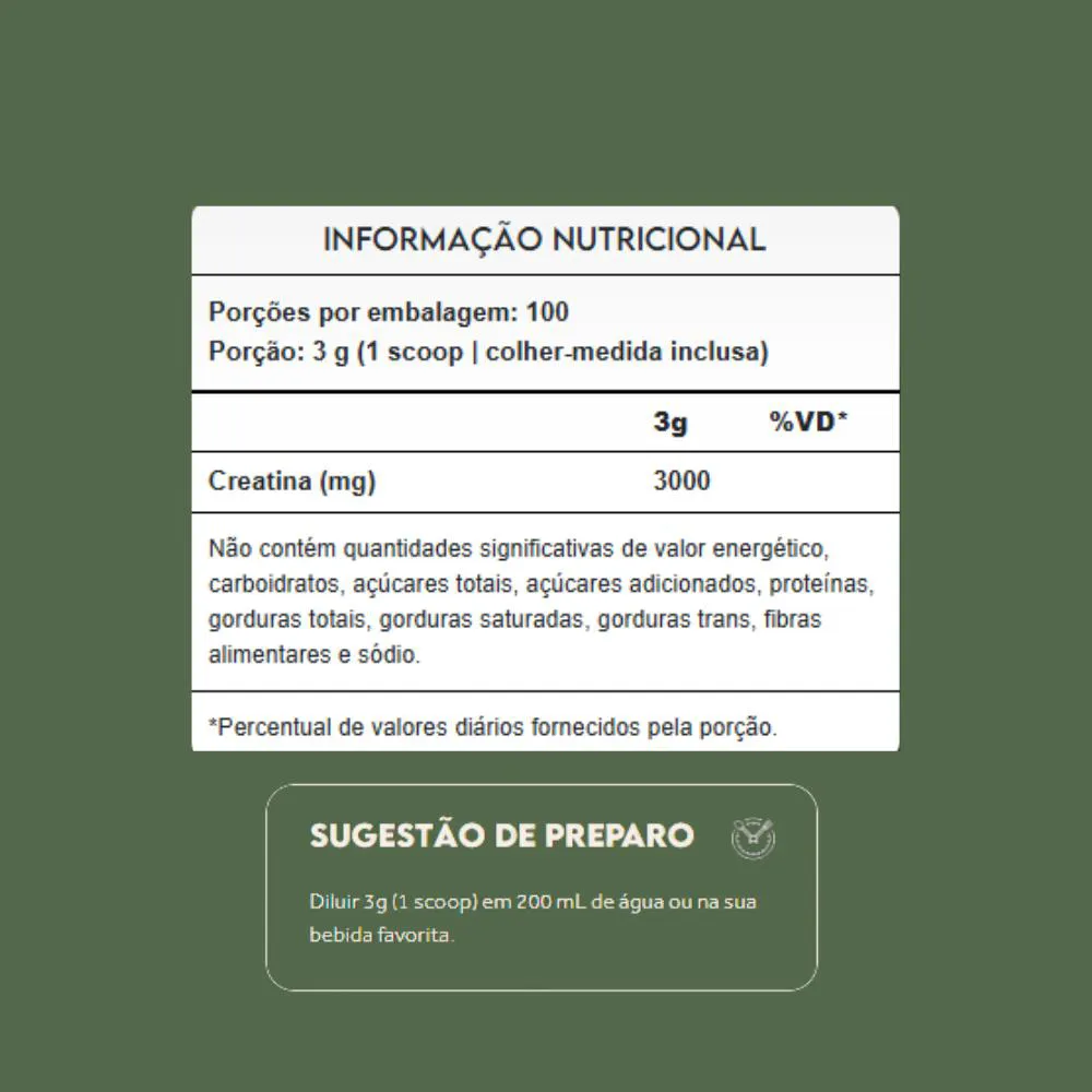 A creatina é um suplemento nutricional natural, composto de creatina monohidratada e micronizada, derivado de fonte vegetal. É um composto encontrado naturalmente em alguns alimentos e sintetizado pelo corpo em pequenas quantidades a partir de aminoácidos. Trata-se de um suplemento premium desenvolvido para potencializar o desempenho físico e auxiliar no metabolismo muscular, podendo ser consumido diluindo 3g (1/3 do scoop) em 200 mL de água.