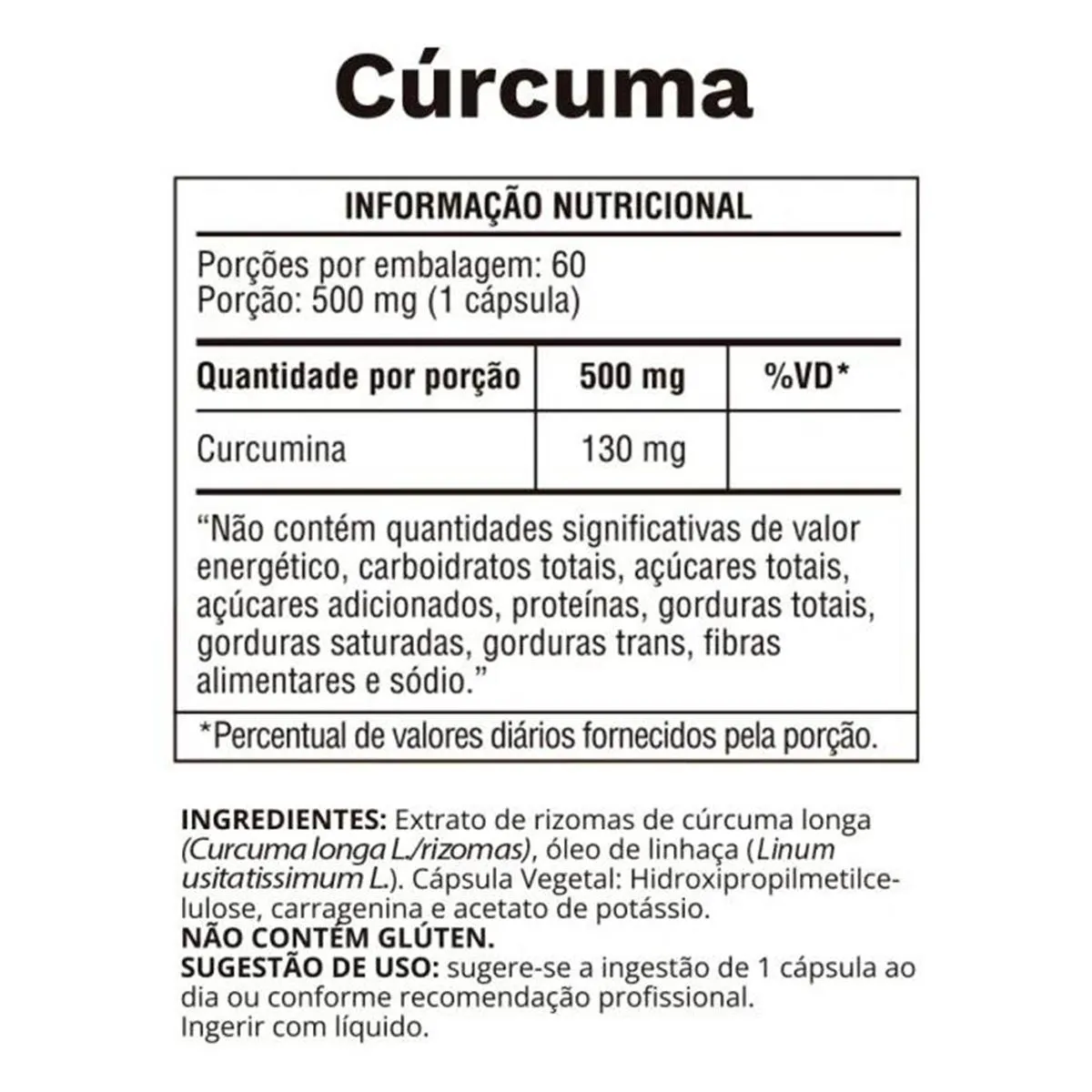 Extrato de rizomas de cúrcuma longa (Curcuma longa L.), óleo de linhaça (Linum usitatissimum L.). Cápsula vegetal: hidroxipropilmetilcelulose, carragenina e acetato de potássio.