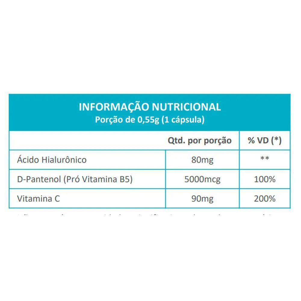 Hialuronato de Sódio (Fonte de Ácido Hialurônico), D-Pantenol (Pró Vitaminas B5) e vitamina C, excipiente: silicato de magnésio, antiumectante: dióxido de silício, cápsula: gelatina e dióxido de titânio.