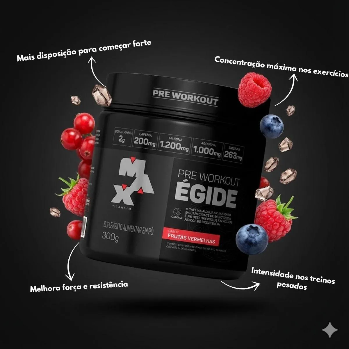 corpo e manter regularidade nos treinos, com praticidade e confiança. Entre os diferenciais do Égide Pré Treino Foco e Desempenho estão a fácil diluição, a composição sem lactose e sem glúten e a versatilidade de uso. A fórmula foi pensada para quem busca foco e desempenho sem complicações, adaptando se facilmente a diferentes rotinas, seja em casa, no trabalho ou na academia. A sugestão de consumo é diluir uma porção em água gelada e ingerir antes da atividade física, conforme orientação profissional. O preparo é simples e rápido, ideal para o pré treino, permitindo mais agilidade nos dias de treino e melhor aproveitamento da rotina esportiva. O kit contém 2 potes de 300g cada, suplemento alimentar em pó do tipo pré treino, sabor frutas vermelhas. Indicado para maiores de 19 anos. Contém beta alanina, taurina, arginina, tirosina e cafeína, além de aromatizantes e edulcorante sucralose. Se você procura égide pré treino foco e desempenho com melhor custo benefício, esta é uma excelente oportunidade. Aproveite o estoque limitado e garanta agora o Kit 2 Égide Pré Treino Max Titanium com preço especial.