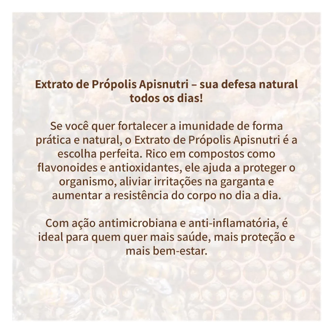 Kit 2 Extrato de Própolis 600mg - 60 Caps – Apisnutri O Extrato de Própolis 600mg da Apisnutri é um suplemento em cápsulas desenvolvido com própolis concentrada, uma substância obtida pelas abelhas a partir de resinas vegetais. Por ser considerada um ingrediente natural tradicionalmente utilizado, pode ser inserido na rotina de cuidados e bem-estar diário. Características do Produto: - Suplemento em cápsulas - 500mg por cápsula - Embalagem com 60 cápsulas cada Potenciais Usos: O produto pode ser utilizado por pessoas que buscam incluir própolis de forma prática no dia a dia, em alternativa às versões líquidas ou sprays. Seu uso é associado ao consumo tradicional desse tipo de ingrediente natural. Informações Técnicas: A forma farmacêutica é cápsula de uso oral. O ingrediente predominante é o extrato de própolis. A composição pode apresentar variação natural de cor, aroma ou sabor devido à origem vegetal do ingrediente e à forma de processamento da própolis. Composição: Extrato de própolis, vitamina C, Vitamina B2 (riboflavina), Vitamina B6 (piridoxina) e Vitamina B12 (cianocobalamina); Além de aditivos usados no processo: antiumectante (fosfato tricálcico) e antiaglutinante/lubrificante (estearato de magnésio). Modo de Uso: O consumo deve seguir as orientações presentes na embalagem que seria 1 capsula 2 vezes ao dia ou conforme recomendação de um profissional habilitado. Armazenamento: Para melhor conservação do produto, manter o frasco bem fechado, em local seco, protegido da luz e dentro da temperatura indicada pelo fabricante. Após aberto, recomenda-se armazenar conforme instruções da embalagem. Precauções: - Produto indicado para uso adulto. - Não é recomendado para pessoas com hipersensibilidade a mel, pólen, própolis ou outros derivados de abelhas. - Não exceder a quantidade diária recomendada. - Suplementos não substituem uma alimentação equilibrada ou hábitos saudáveis. - Em caso de reação ou desconforto, suspender o uso e procurar orientação profissional. - Manter fora do alcance de crianças. - Não consumir se o lacre estiver violado. - Não Contém Glúten SOBRE A LOJA: Somos a rede de farmácias mais antiga de São José dos Pinhais, atuando no ramo farmacêutico desde 1990 com comprometimento à qualidade e satisfação do cliente. É um prazer compartilhar os nossos valores e as nossas conquistas com quem confia no nosso trabalho! Imagens dos Produtos são Meramente Ilustrativas. Todas as Informações Divulgadas são de Responsabilidade Exclusiva do Fabricante/fornecedor.