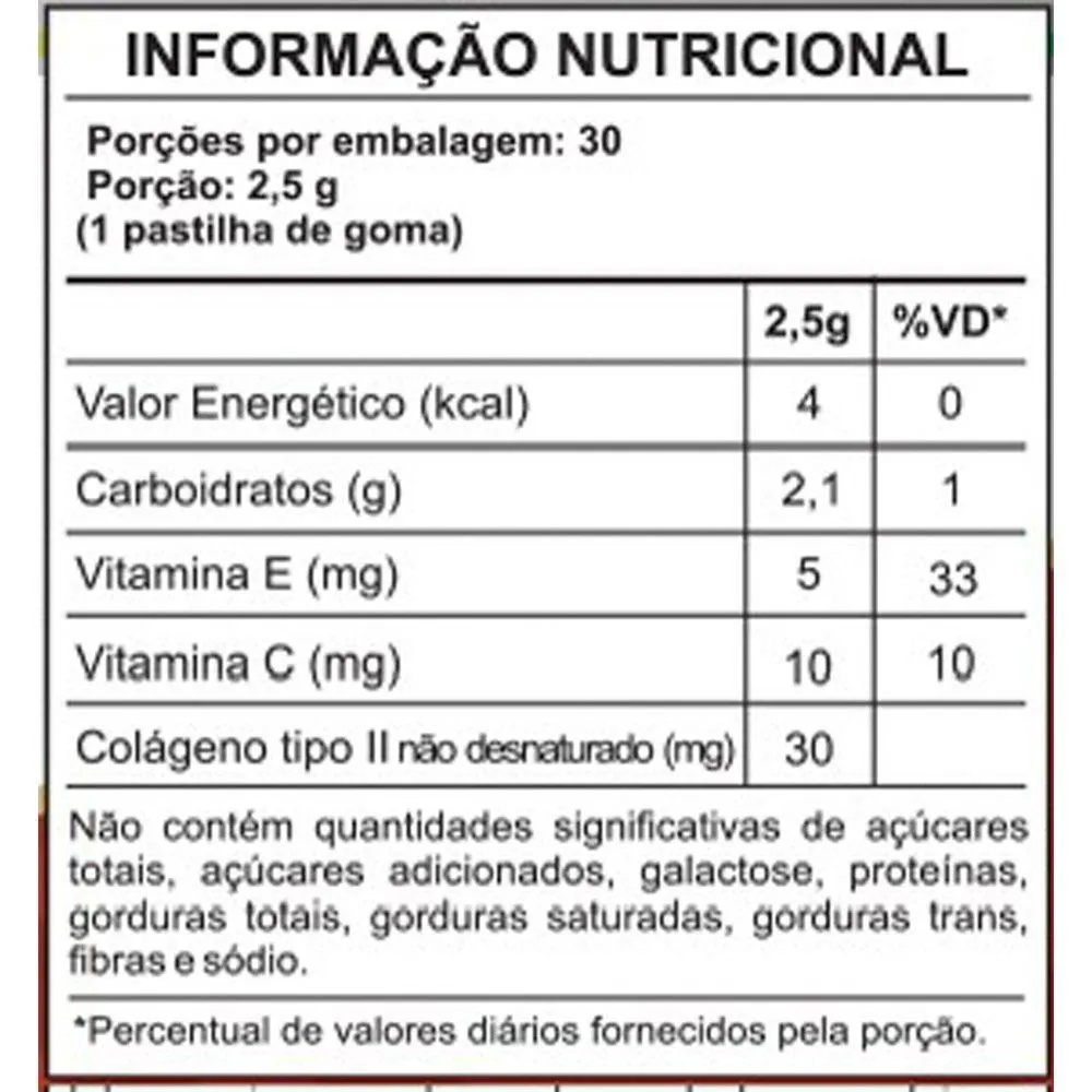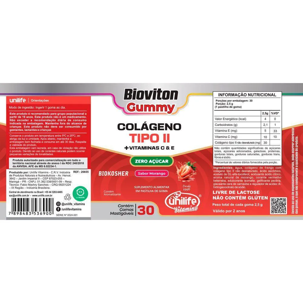 O produto é um suplemento alimentar em formato de gomas mastigáveis de colágeno tipo II, com sabor de morango. Destina-se a auxiliar na nutrição e suporte articular, oferecendo uma forma prática e saborosa de consumir colágeno, com adição de vitaminas C e E, sendo indicado para contribuir com a saúde das articulações e bem-estar geral.