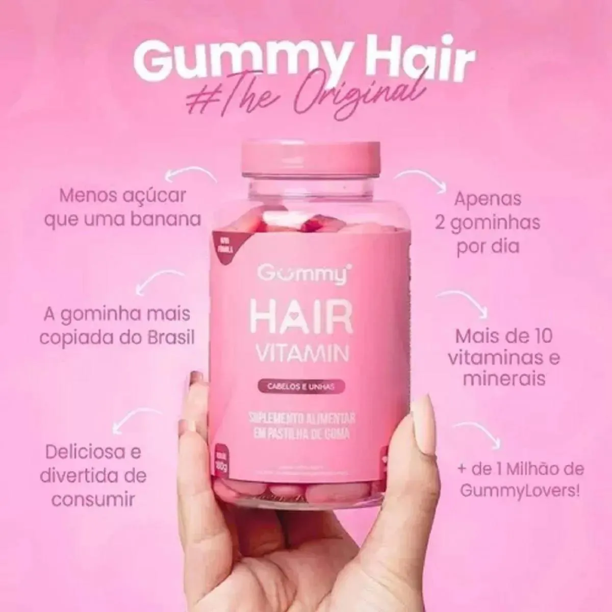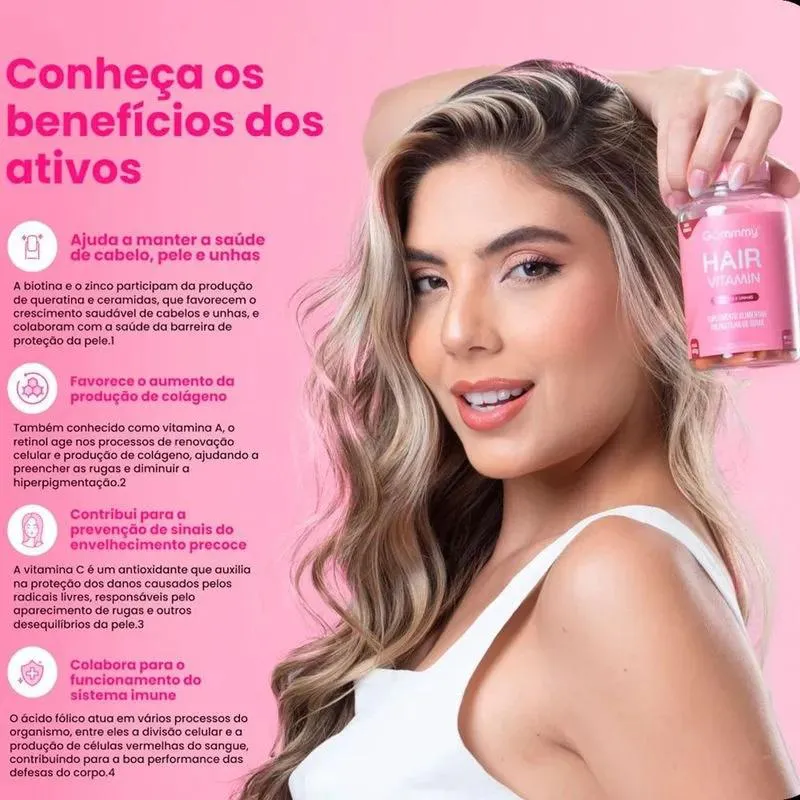 O Kit 2 Gummy Hair Vitamin é um suplemento alimentar em formato de gomas com sabor tutti-frutti, composto por vitaminas A, D2, E, C, B5, B6 e B12, desenvolvido para complementar a nutrição e apoiar a saúde dos cabelos e unhas. Serve para auxiliar na obtenção de nutrientes essenciais, prevenir deficiências alimentares, colaborar com o bem-estar geral e apoiar uma dieta balanceada, especialmente para pessoas com ritmo de vida acelerado que necessitam de complementação nutricional.