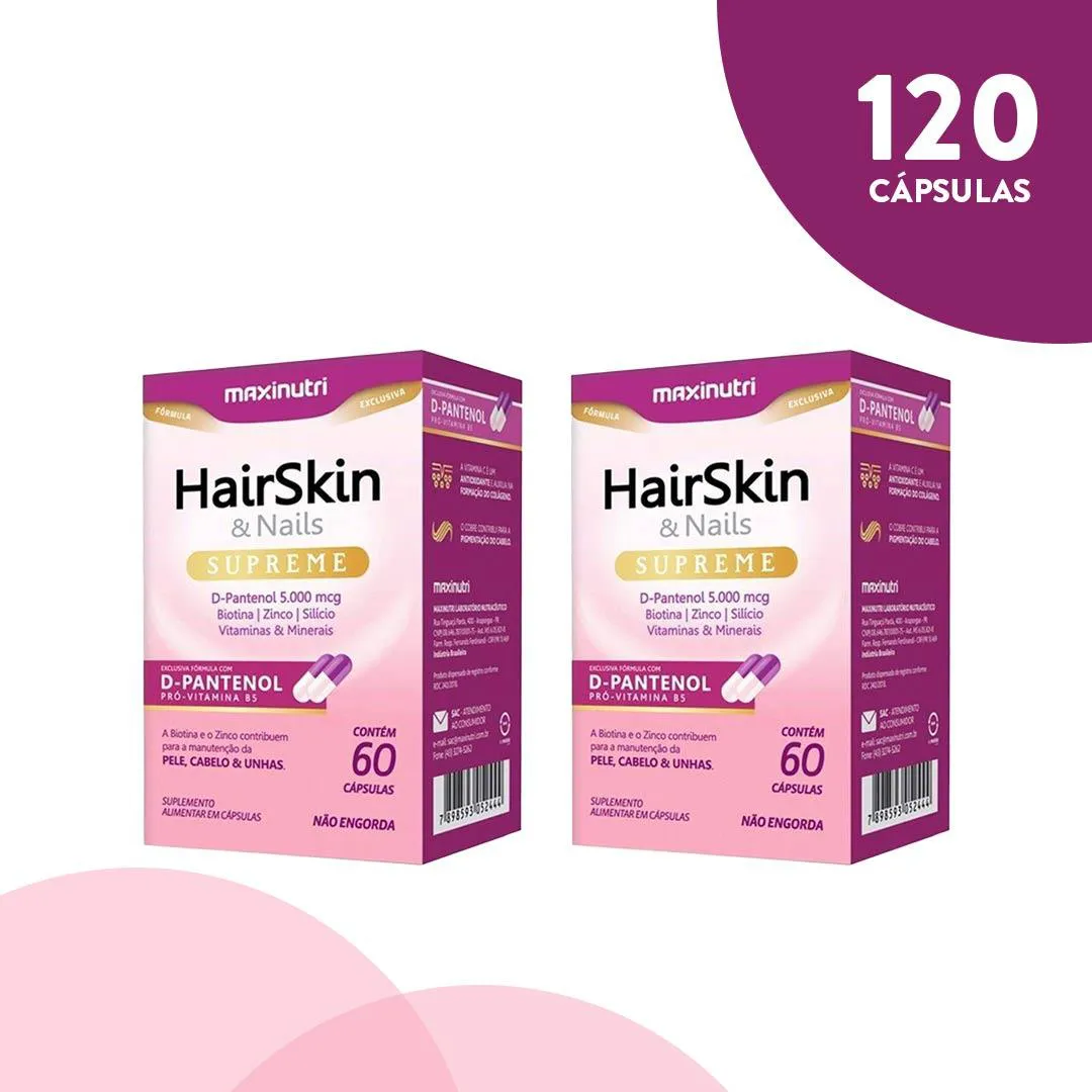 Kit com 2 HairSkin Supreme 60 cápsulas | Maxinutri HairSkin Supreme é um suplemento alimentar formulado com vitaminas, minerais e compostos bioativos de ação trófica sobre tecidos epiteliais de alta renovação, como pele, anexos cutâneos (cabelos e unhas) e mucosas. Sua formulação é orientada para suporte à síntese de colágeno, queratina e elastina, além da modulação antioxidante e equilíbrio do metabolismo cutâneo. Principais Components Ativos (porção diária – 2 cápsulas): D-Pantenol (Pró-vitamina B5):