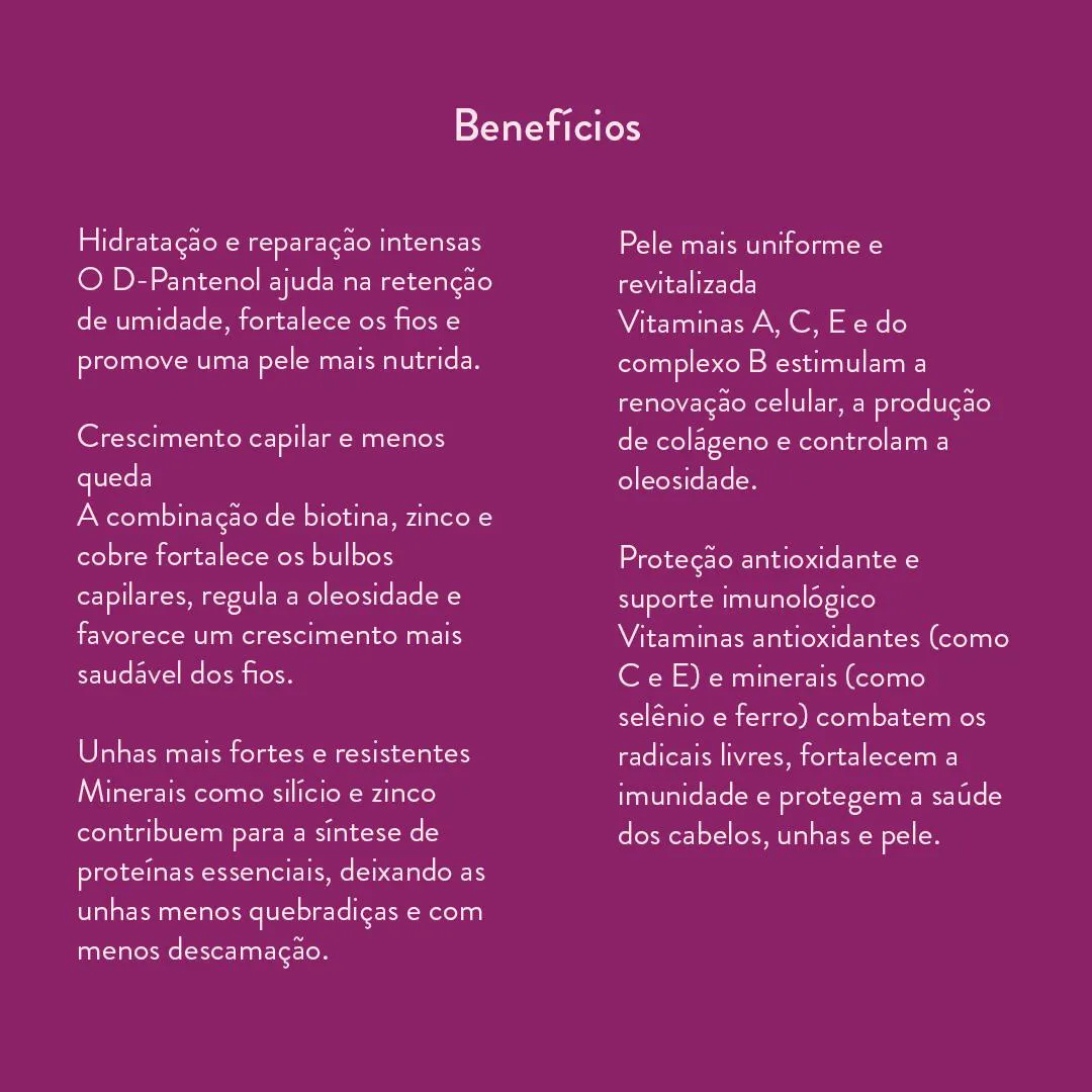 - Desenvolvido para saúde da pele, cabelos e unhas.