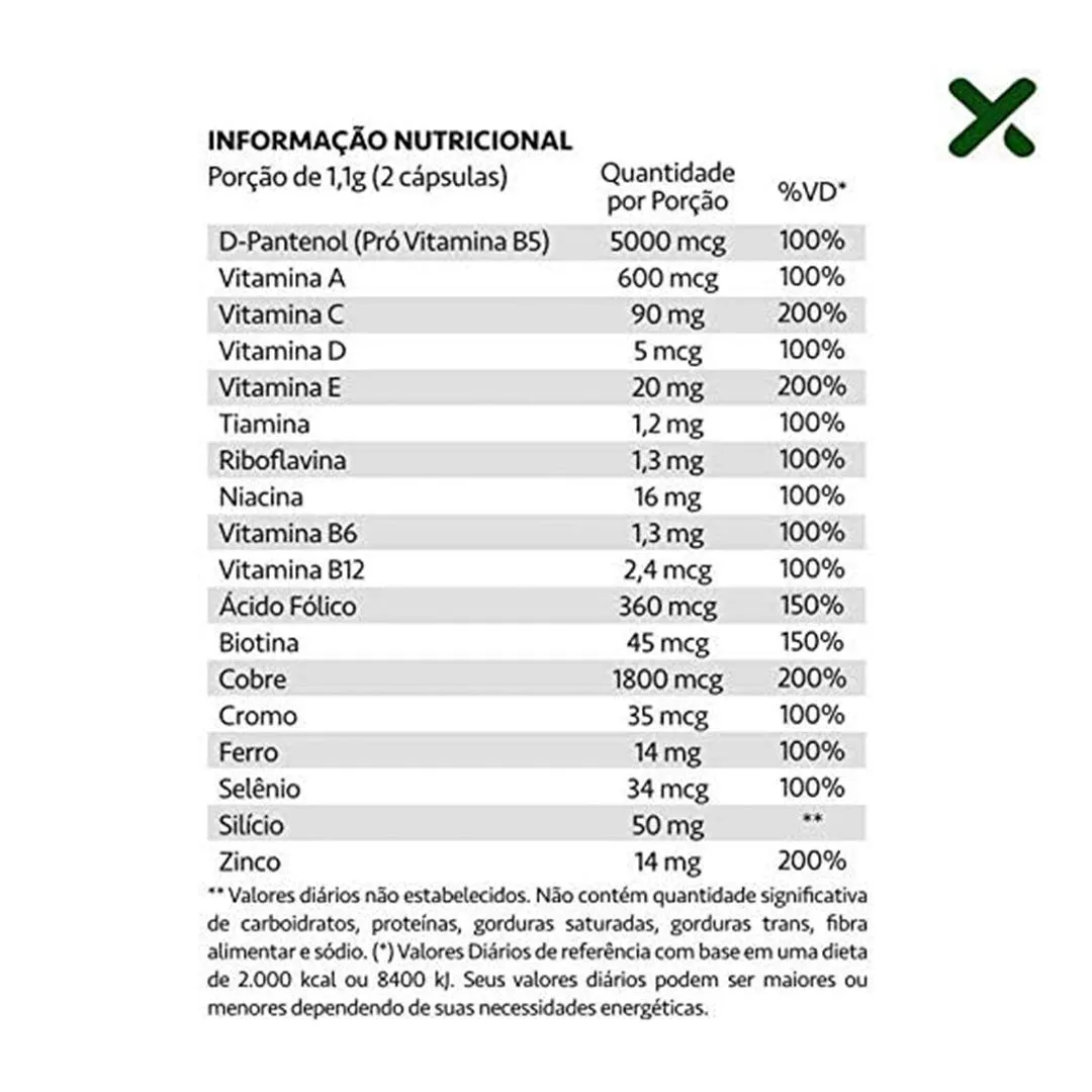 Participam de reações redox, síntese proteica e pigmentação capilar Mecanismos de Ação Nutricional: Síntese de queratina e colágeno: ativação de enzimas dependentes de vitamina C, biotina, silício e B5 para produção de proteínas estruturais da pele, fios e unhas. Equilíbrio antioxidante: vitamina E, C, selênio e cobre atuam em sinergia para neutralizar radicais livres e proteger estruturas celulares da oxidação. Regulação da diferenciação epitelial: retinol e vitaminas do complexo B participam da renovação celular da epiderme e da matriz capilar. Manutenção da integridade de mucosas e tecido conjuntivo: o silício estabilizado contribui para a reticulação do colágeno e para a elasticidade dos tecidos. Atividade cofatorial em rotas metabólicas cutâneas: micronutrientes como zinco, manganês e cromo atuam como catalisadores em rotas bioquímicas de renovação celular. Dados de Composição Quantitativa (valores aproximados por 2 cápsulas): - D-Pantenol: ~5.000 mcg - Biotina: 45mcg - Vitamina C: 45mg - Vitamina A: 600 mcg RE - Vitamina E: 10 mg α-TE - Vitamina D3: 5 mcg (200 UI) - Zinco: 7mg - Selênio: 34mcg - Cobre: 900mcg - Cromo: 35mcg - Ferro: 14mg Posologia e Apresentação: - Modo de uso: Ingerir 2 cápsulas ao dia, preferencialmente junto das principais refeições. - Apresentação: Frasco contendo 60 cápsulas (30 doses). - Conservação: Conservar em local seco, ao abrigo da luz e umidade. - Público-alvo: Adultos ≥ 19 anos. - Contraindicações: não indicado para gestantes, lactantes ou crianças sem orientação profissional. Informações Regulatórias: - Não contém glúten. - Produto dispensado de registro conforme RDC nº 240/2018 – ANVISA. - Classificação: suplemento alimentar. - Advertência: manter fora do alcance de crianças; não exceder a ingestão diária recomendada. SOBRE A LOJA: Somos a rede de farmácias mais antiga de São José dos Pinhais, atuando no ramo farmacêutico desde 1990 com comprometimento à qualidade e satisfação do cliente. É um prazer compartilhar os nossos valores e as nossas conquistas com quem confia no nosso trabalho! Imagens dos Produtos são Meramente Ilustrativas. Todas as Informações Divulgadas são de Responsabilidade Exclusiva do Fabricante/fornecedor.