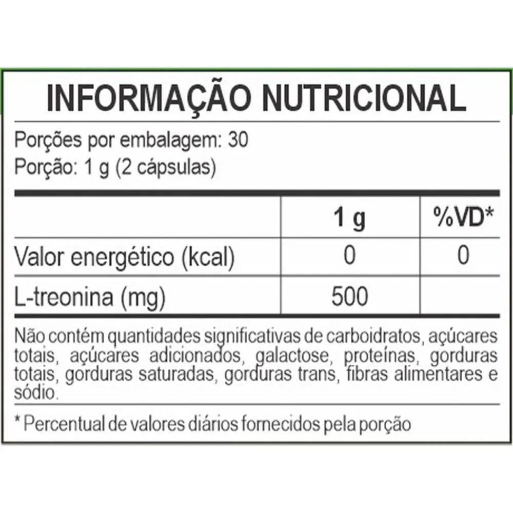 L-Treonina, agente de massa celulose e antiumectantes dióxido de silício e estearato de magnésio. Cápsula: gelatina vegetal e água purificada.