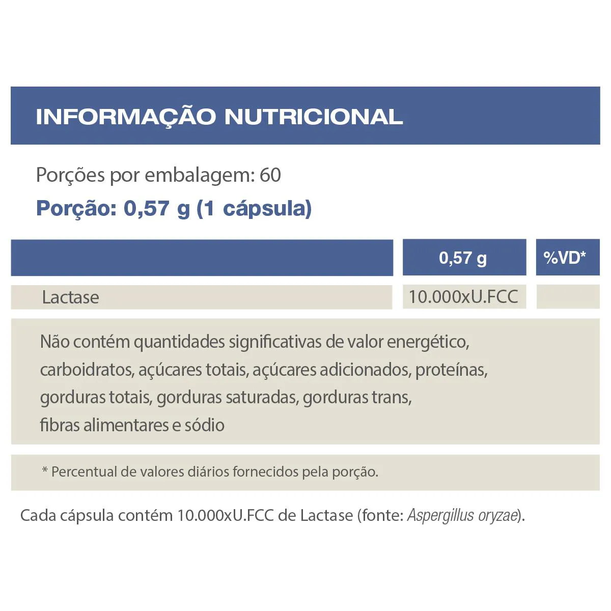 - Selo de Qualidade VLabor. Recomendações de Uso: - Suplemento alimentar de uso adulto (a partir de 19 anos de idade): ingerir 1 cápsula ao dia ou seguir a recomendação de um profissional da saúde. A porção deve ser ajustada às necessidades individuais de suplementação de lactase e o consumo de alimentos contendo lactose. Cuidados e Conservação: - Manter o produto bem fechado e conservar ao abrigo da luz, calor, odor e umidade.