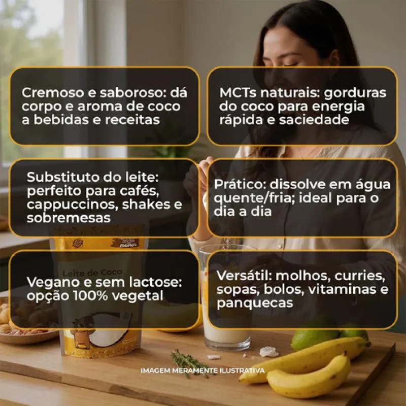 Basta misturar o pó em água ou bebida vegetal na proporção desejada para obtenção de leite de coco cremoso. Seu uso é versátil: pode ser incorporado em cafés,