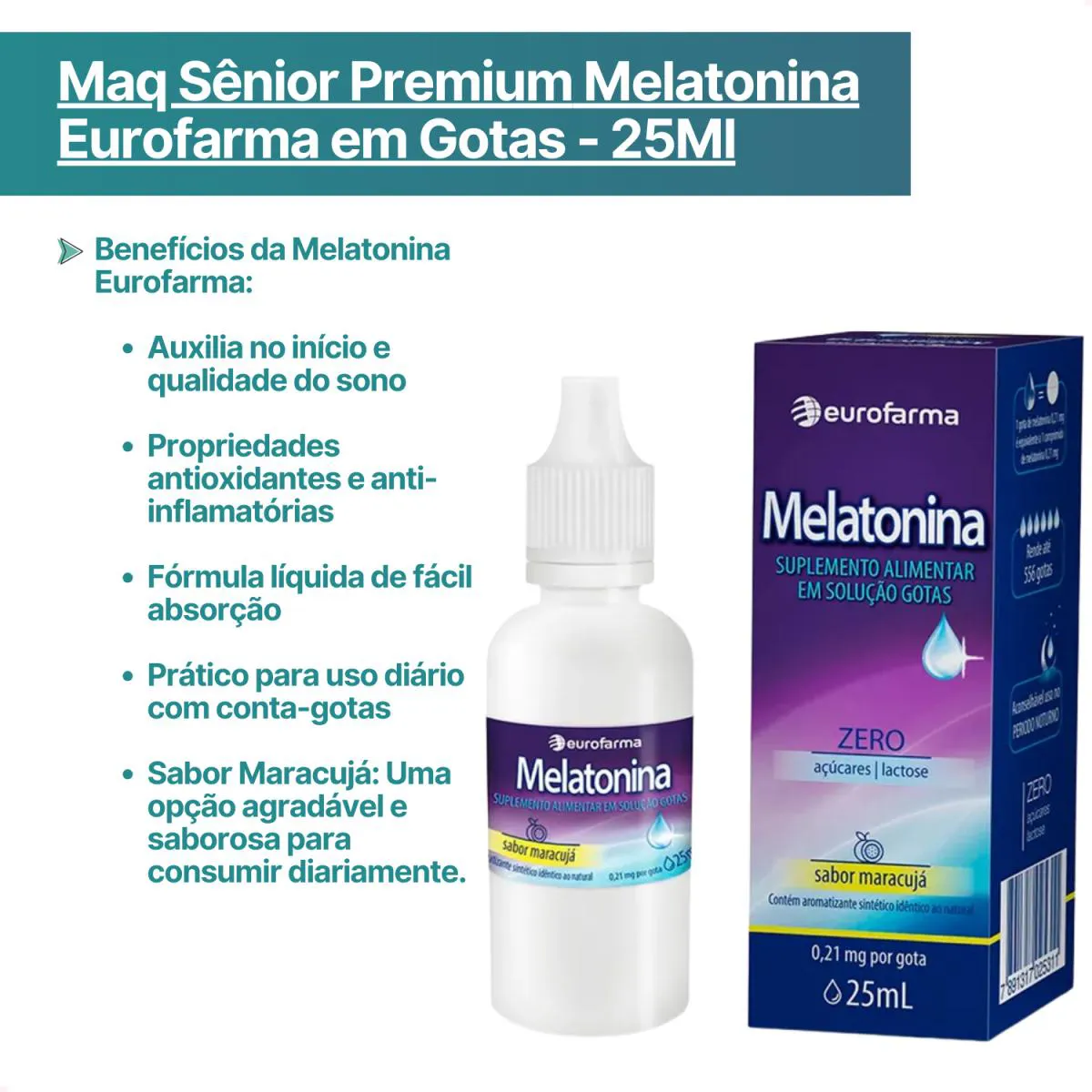 A Melatonina Eurofarma é um suplemento alimentar em gotas desenvolvido para auxiliar no relaxamento e na regulação do sono, promovendo noites mais tranquilas e repousantes. Ideal para quem enfrenta dificuldades para dormir, sua fórmula prática e saborosa é perfeita para o uso diário.