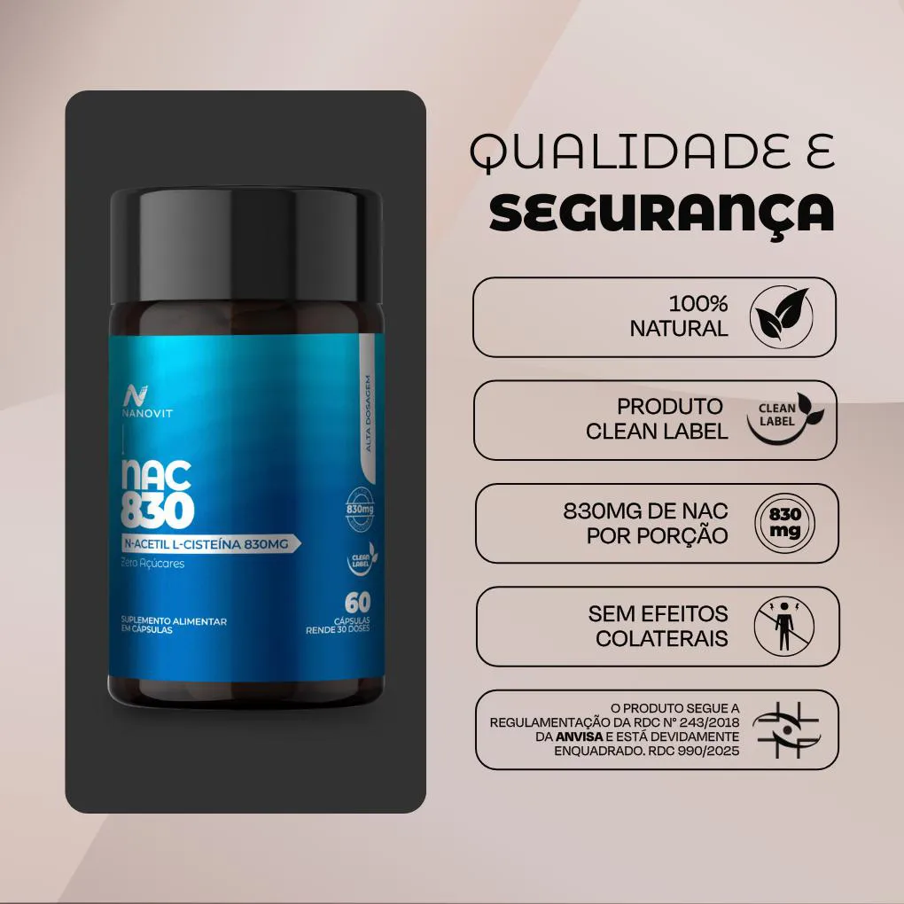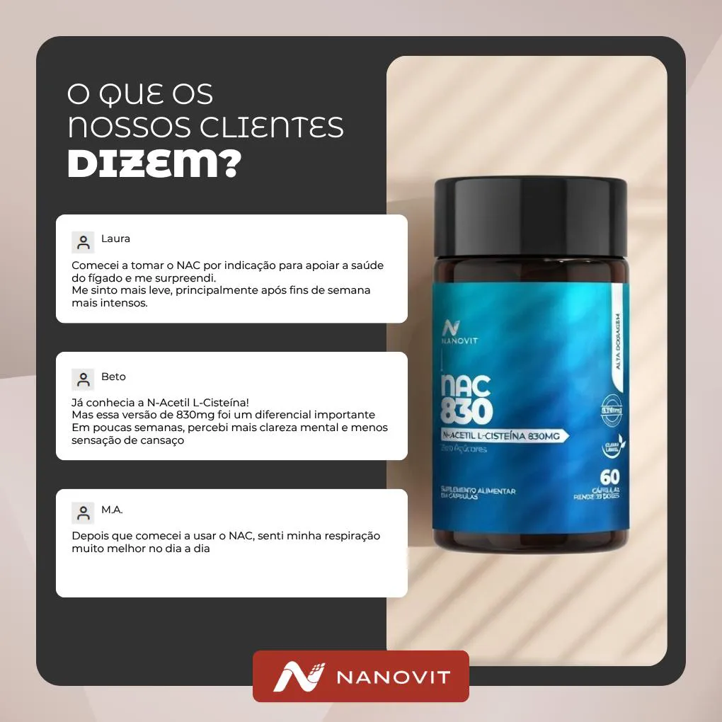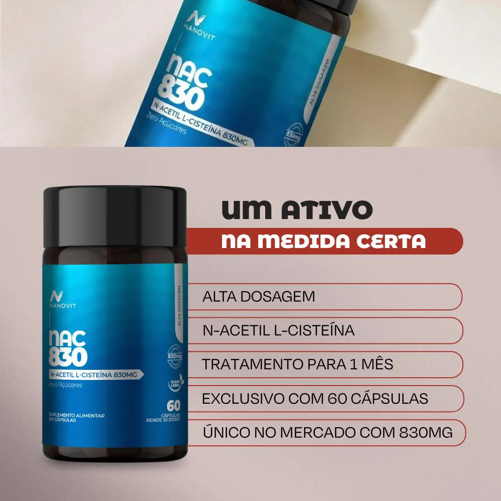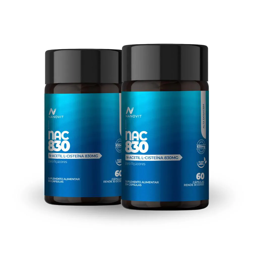 Kit 2x NAC (N-Acetil L-Cisteína) - 830mg - 60 cápsulas – Nanovit O NAC da Nanovit é um suplemento desenvolvido para auxiliar na proteção celular e no equilíbrio do organismo.