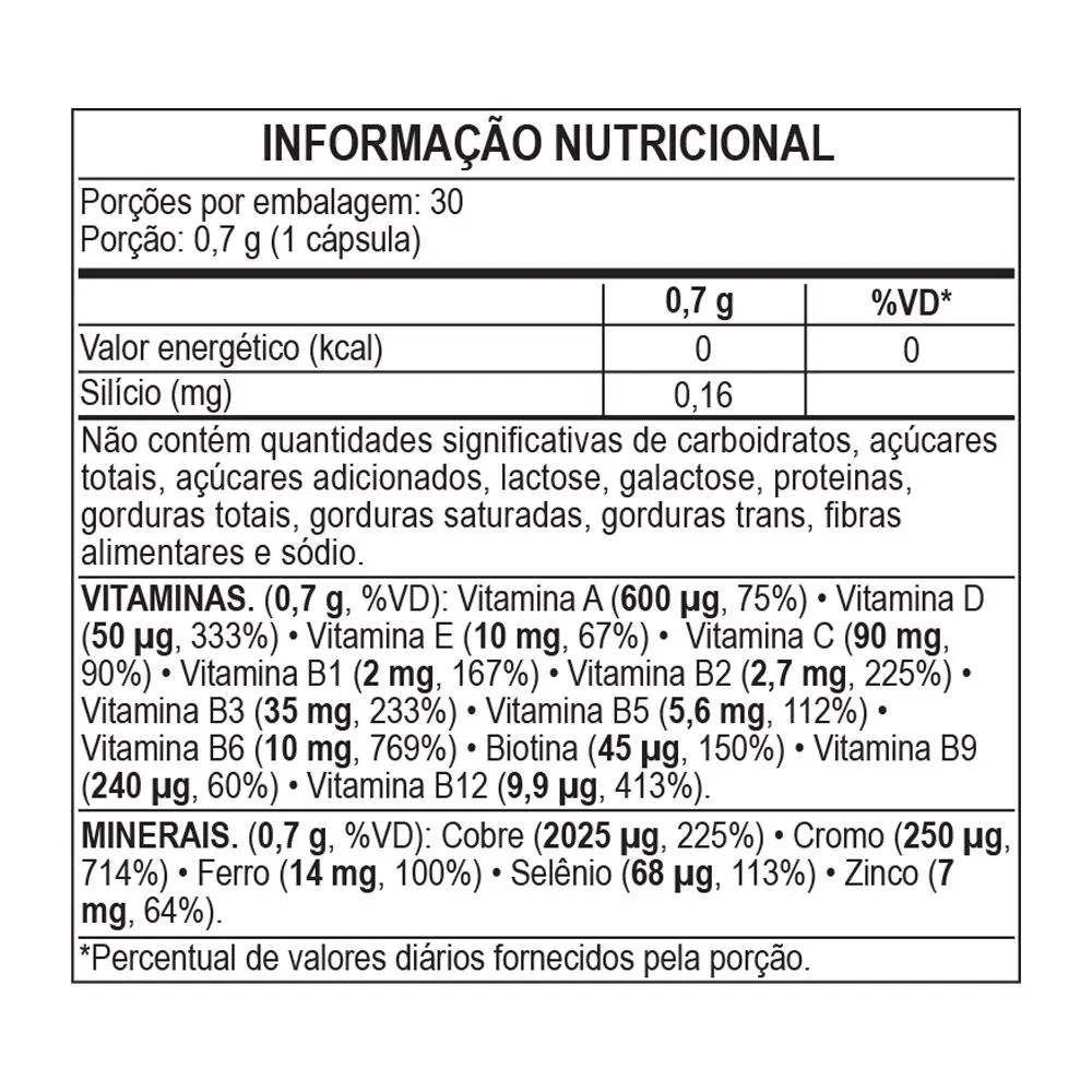 Ingredientes: ácido ascórbico, bisglicinato de ferro, nicotinamida, bisglicinato de zinco, acetato de DL-alfa-tocoferol,L-selenometionina, cloridrato de piridoxina, ácido ortosilícico estabilizado em maltodextrina (SILICIUMAX), bisglicinato de cobre,D-pantotenato de cálcio, acetato de retinol, riboflavina, picolinato de cromo, cloridrato de tiamina, ácido fólico, colecalciferol, D-biotina,cianocobalamina, agente de massa celulose microcristalina e antiumectantes estearato de magnésio e dióxido de silício. Cápsula: gelatina e corante dióxido de titânio.