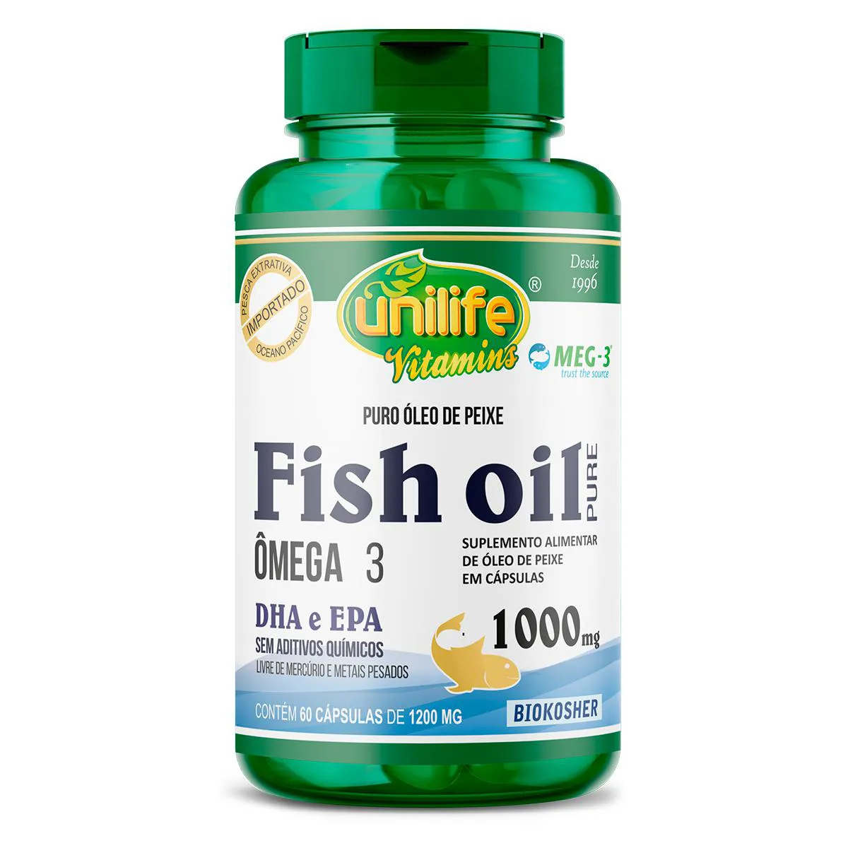 O Óleo de Peixe Fish Oil Unilife é um suplemento nutricional composto por cápsulas de óleo de peixe, desenvolvido através de um processo de extração específico e certificado como BIOKOSHER. Cada cápsula contém 1000mg de óleo de peixe, sendo livre de glúten e acondicionado em embalagem com 60 cápsulas. Serve para complementar a dieta diária, fornecendo os nutrientes e benefícios do óleo de peixe de forma prática e conveniente, podendo ser consumido mediante ingestão de 1 a 2 cápsulas duas vezes ao dia, após as principais refeições.