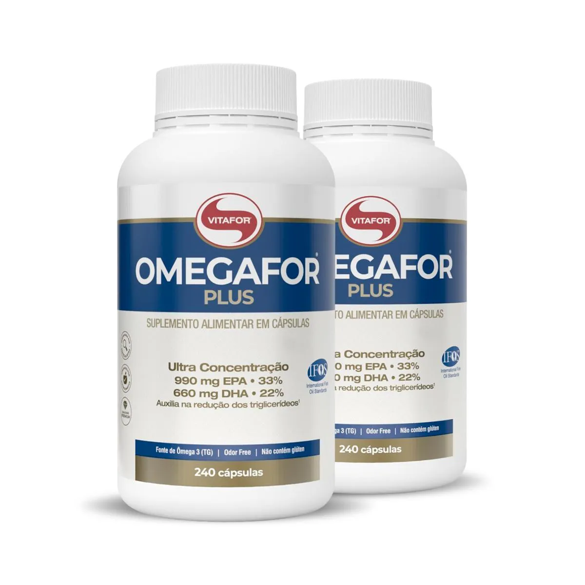 Kit 2 Ômegafor Plus Vitafor 240 cápsulas O Omegafor Plus® é um suplemento alimentar à base de óleo de peixe, rico em ácidos graxos ômega 3, especialmente EPA (ácido eicosapentaenóico) e DHA (ácido docosahexaenóico). Esses ácidos graxos são conhecidos por seus benefícios à saúde, como a redução dos triglicerídeos e o suporte à saúde cardiovascular.