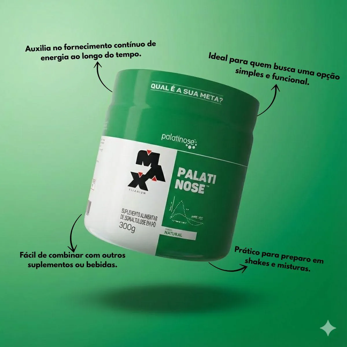 corpo e da mente com escolhas mais conscientes. Versátil e fácil de consumir, a Palatinose pode ser utilizada antes das atividades físicas ou em outros momentos do dia, conforme as necessidades individuais. Também pode ser combinada com outros suplementos, permitindo ajustes personalizados de acordo com a rotina e os objetivos de cada pessoa. O preparo é simples e rápido, ideal para o dia a dia. Basta misturar uma porção em água ou na bebida de sua preferência, utilizando coqueteleira ou liquidificador até completa dissolução. Uma solução prática para quem busca facilidade sem abrir mão da qualidade. O kit contém 2 embalagens de 300g cada, suplemento em pó, sabor natural, composto exclusivamente por isomaltulose. Não contém glúten. Produto dispensado de registro na ANVISA conforme RDC nº 27 2010. Indicado para adultos e praticantes de atividade física. Aproveite o estoque limitado e garanta agora o Kit 2 Palatinose Carboidratos Suplemento Natural Max Titanium para tornar sua rotina ainda mais completa e funcional.