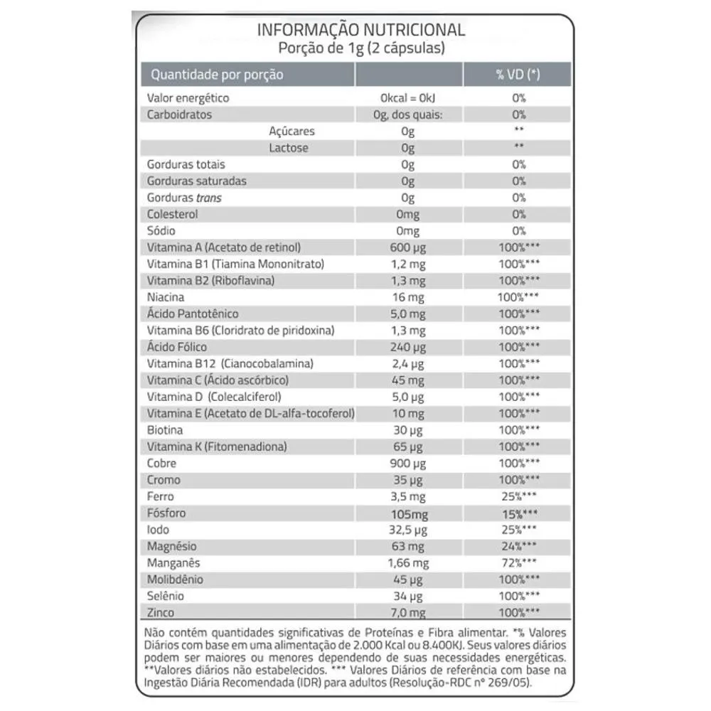 Fosfato de cálcio, Óxido de magnésio, vitamina C revestida, dl-alfa-acetato de tocoferol, Nicotinamida, Pirofosfato de ferro, Óxido de zinco, Sulfato de manganês, Fitomenadiona, Vitamina A acetato, Pantotenato de cálcio, Vitamina B12, Sulfato de cobre, Vitamina D3, Biotina, Riboflavina, Cloridrato de piridoxina, Molibdato de sódio, Tiamina mononitrato, Selenito de sódio, Iodeto de potássio, Ácido fólico, Picolinato de cromo. Estabilizante: Celulose Microcristalina (INS 460i). Antiumectante: Dióxido de silício (INS 551). Lubrificante: Estearato de magnésio (INS 471iii). Gelificante: gelatina (INS 428). Acidulante: Ácido acético (INS 260). Corantes: Dióxido de titânio (INS 171), Azorubina (INS 122), Azul brilhante (INS 133) e Amarelo quinoleína (INS 104). Ingestão Recomendada