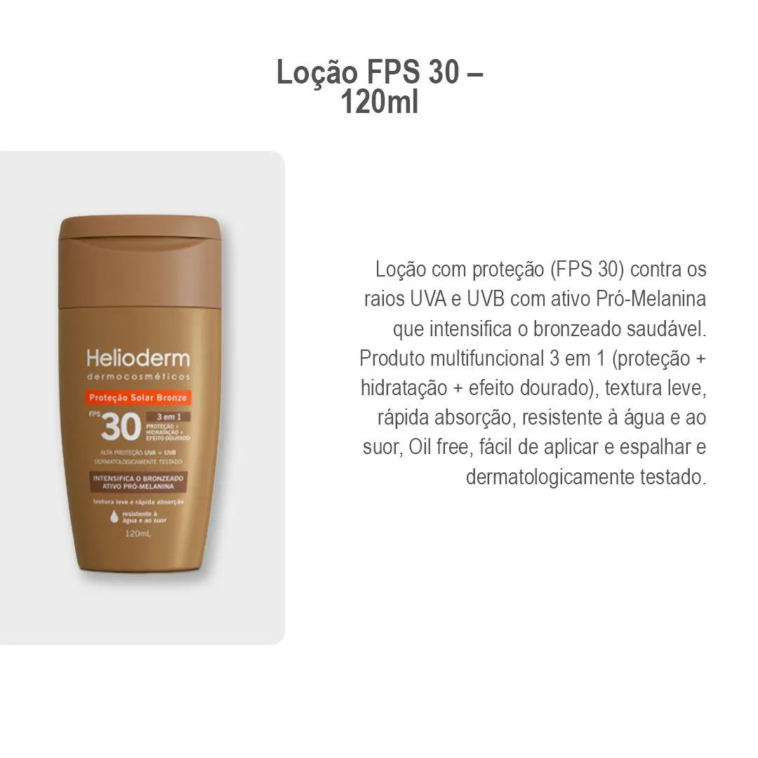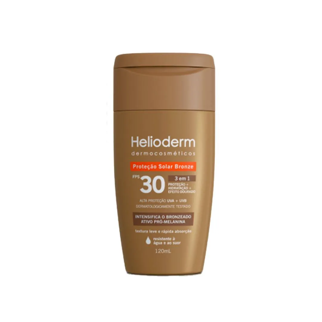 Kit com 2 Protetor Helioderm Bronze Fps 30 - 120ml - Kley Hertz O protetor solar Helioderm Bronze FPS 30, foi desenvolvido para oferecer proteção solar ampla e auxiliar no cuidado diário da pele durante a exposição ao sol. Com FPS 30, contribui para a defesa contra os efeitos da radiação UVA e UVB, principais responsáveis por agressões solares e envelhecimento precoce da pele. Sua fórmula é enriquecida com o complexo Pró-Melanina, que atua estimulando a pigmentação natural, favorecendo um bronzeado uniforme. A textura é oil-free, com toque seco e rápida absorção, ideal para quem busca conforto sem deixar a pele oleosa. O produto também oferece hidratação, ajudando na manutenção da maciez da pele mesmo em ambientes de calor, praia ou piscina. Além disso, é resistente à água e ao suor, prolongando a eficácia durante atividades ao ar livre. Características técnicas: - FPS 30: proteção contra radiação UVA e UVB. - Pró-Melanina: ativo que estimula a pigmentação natural da pele. - Oil-free: fórmula leve, rápida absorção e toque seco. - Hidratação: auxilia na manutenção da maciez da pele. - Resistente à água e ao suor. - Apresentação: frasco de 120 ml. Modo de uso: - Aplicar de maneira uniforme sobre a pele seca, 30 minutos antes da exposição solar. - Reaplicar a cada 2 horas ou após sudorese intensa, mergulho ou secagem com toalha. - Evitar contato com os olhos e manter fora do alcance de crianças. SOBRE A LOJA: Somos a rede de farmácias mais antiga de São José dos Pinhais, atuando no ramo farmacêutico desde 1990 com comprometimento à qualidade e satisfação do cliente. É um prazer compartilhar os nossos valores e as nossas conquistas com quem confia no nosso trabalho! Imagens dos Produtos são Meramente Ilustrativas. Todas as Informações Divulgadas são de Responsabilidade Exclusiva do Fabricante/fornecedor.