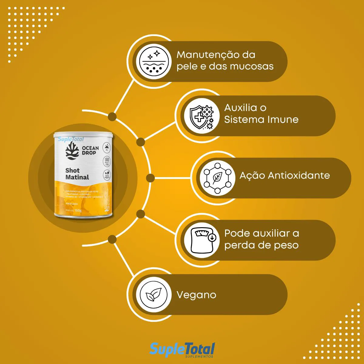 O Shot Matinal da Ocean Drop contém vitamina A, vitamina B6, vitamina B12 e vitamina c que, juntas, oferecem benefícios, como auxiliar no(a):