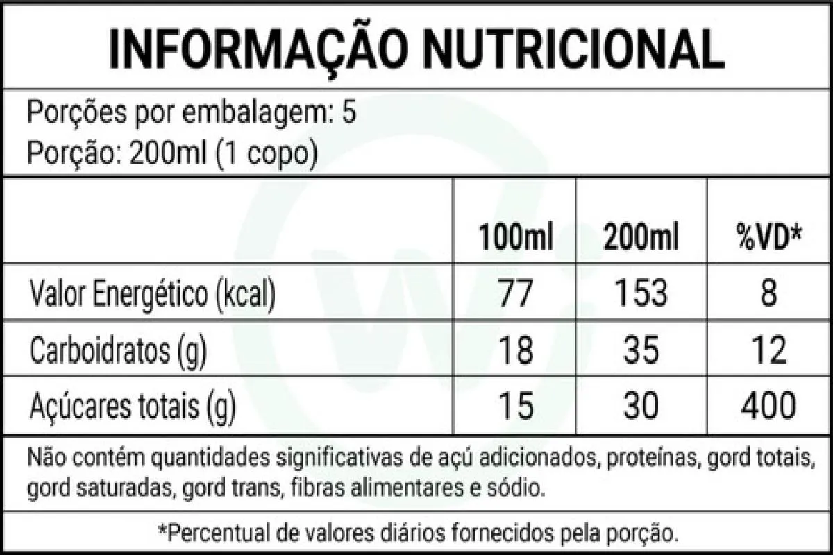 - Suco 100% natural, elaborado exclusivamente com uva Isabel, sem adição de açúcares ou conservantes.