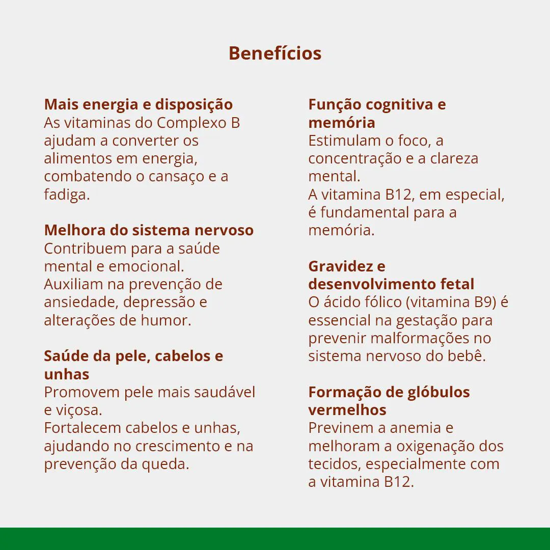 Composição típica:- B1 (tiamina): atua na conversão de glicose em energia e na função neuromuscular