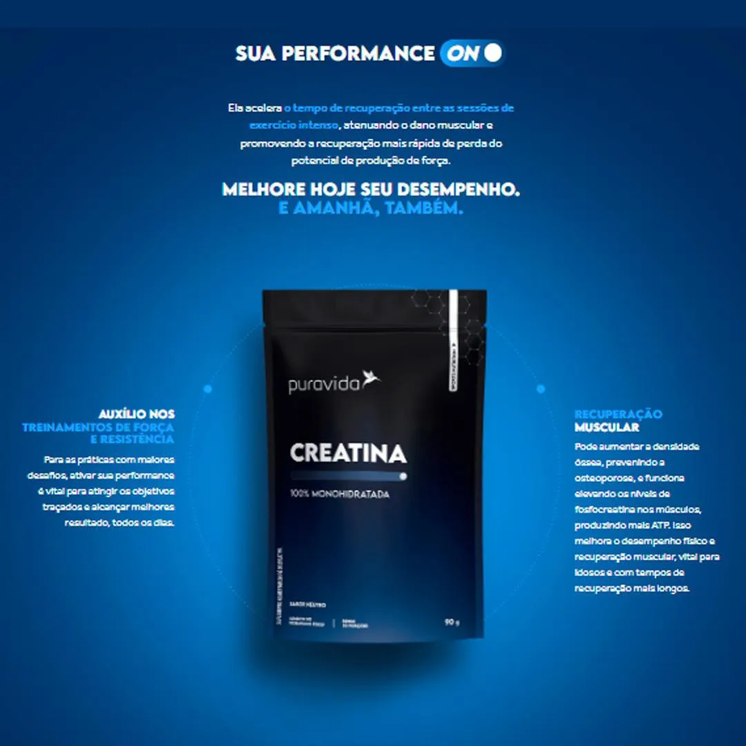 Creatina 100% Monohidratada da Puravida é um suplemento alimentar de alta pureza, composto exclusivamente por creatina monohidratada micronizada, sem adição de substâncias auxiliares, adoçantes, corantes ou aromatizantes.