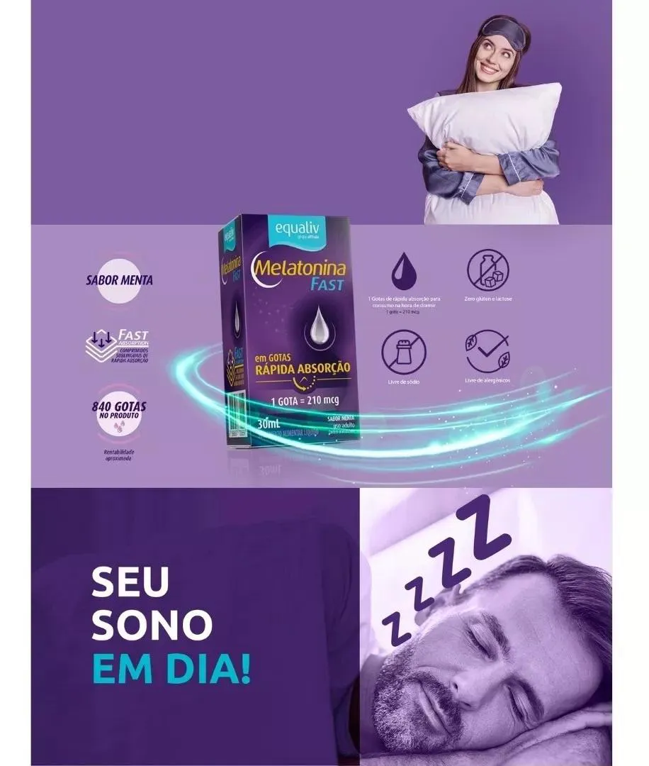 Sua principal função é informar ao cérebro a hora de dormir, diminuindo o tempo gasto para adormecer, favorecendo o descanso de qualidade. Equaliv Melatonina Fast contribui para o bom metabolismo energético, podendo exercer benefícios auxiliares no controle do estresse, na melhorar do rendimento no trabalho e na prática de exercícios, desde que, a suplementação esteja associada a bons hábitos alimentares e de saúde.