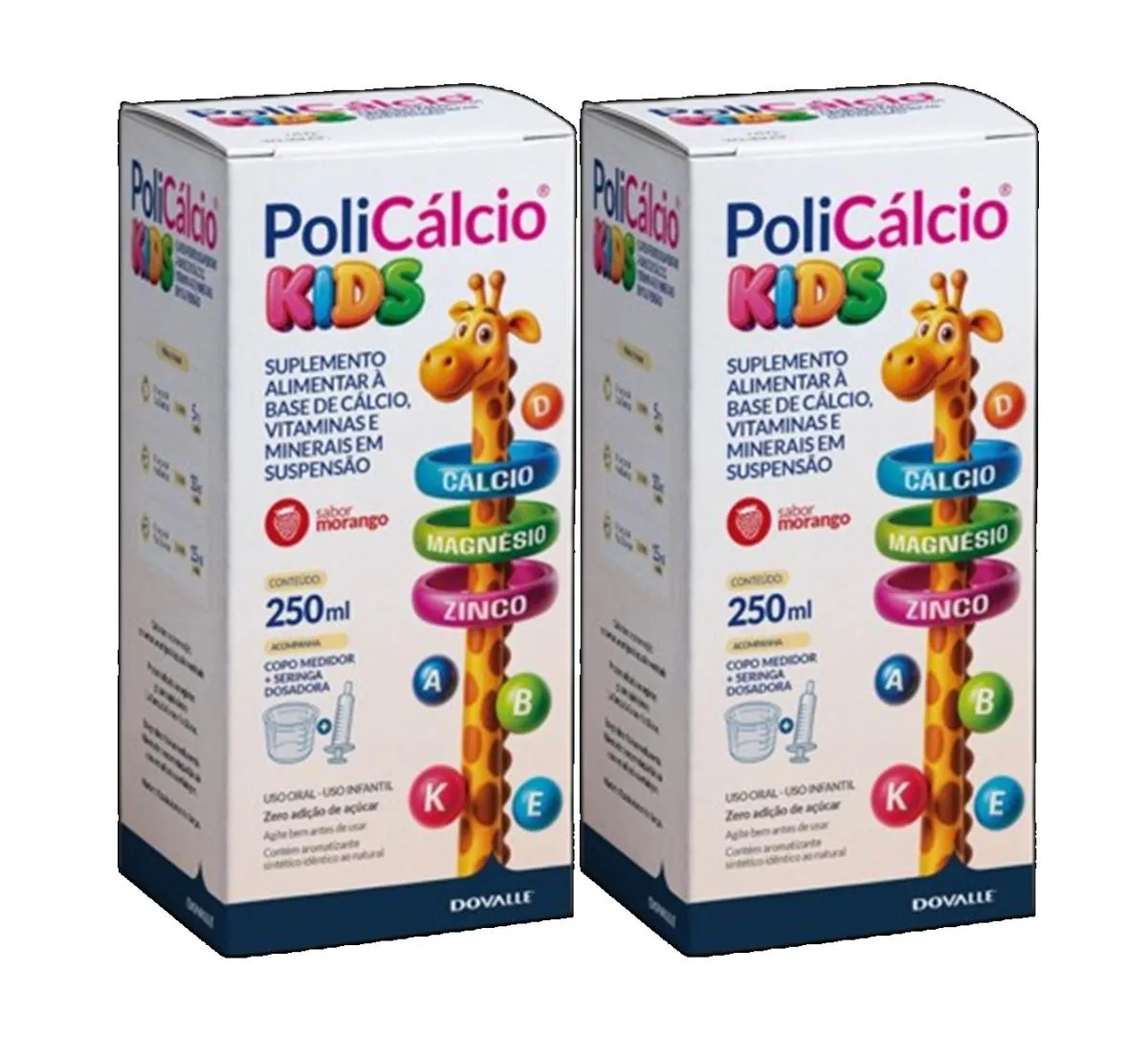 Kit 2 Suplemento PoliCálcio Kids 250ml - Dovalle O PoliCálcio Kids é um suplemento infantil em suspensão oral, com sabor morango e fórmula que combina cálcio, magnésio, zinco e vitaminas A, B, D, E e K. Livre de glúten, lactose e adição de açúcar, é uma opção prática para complementar a ingestão diária de nutrientes essenciais. Embalagem de 250 ml. Imagens Meramente Ilustrativas. Todas as Informações Divulgadas são de Responsabilidade Exclusiva do Fabricante/fornecedor.