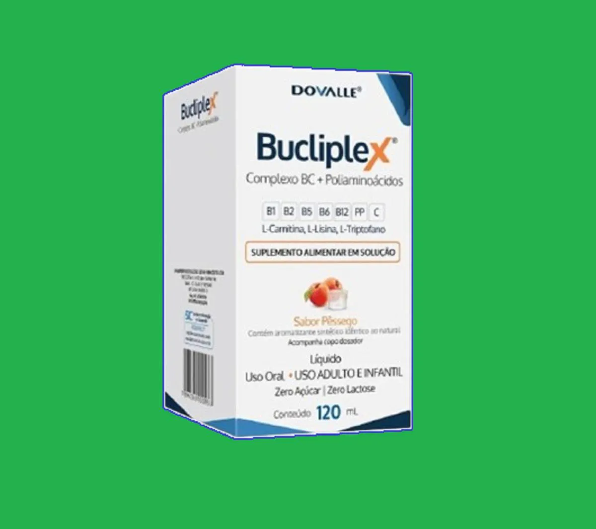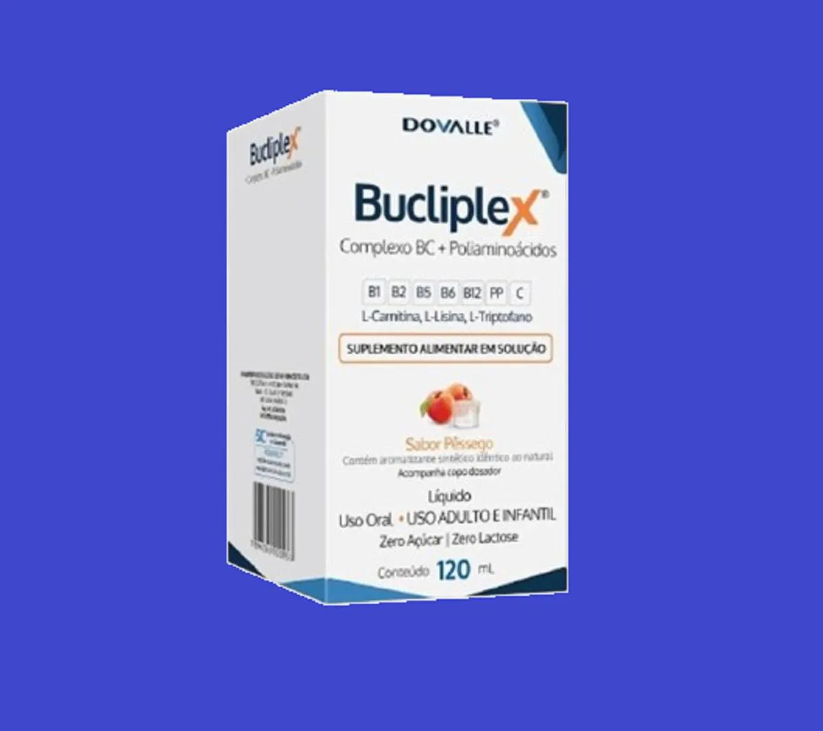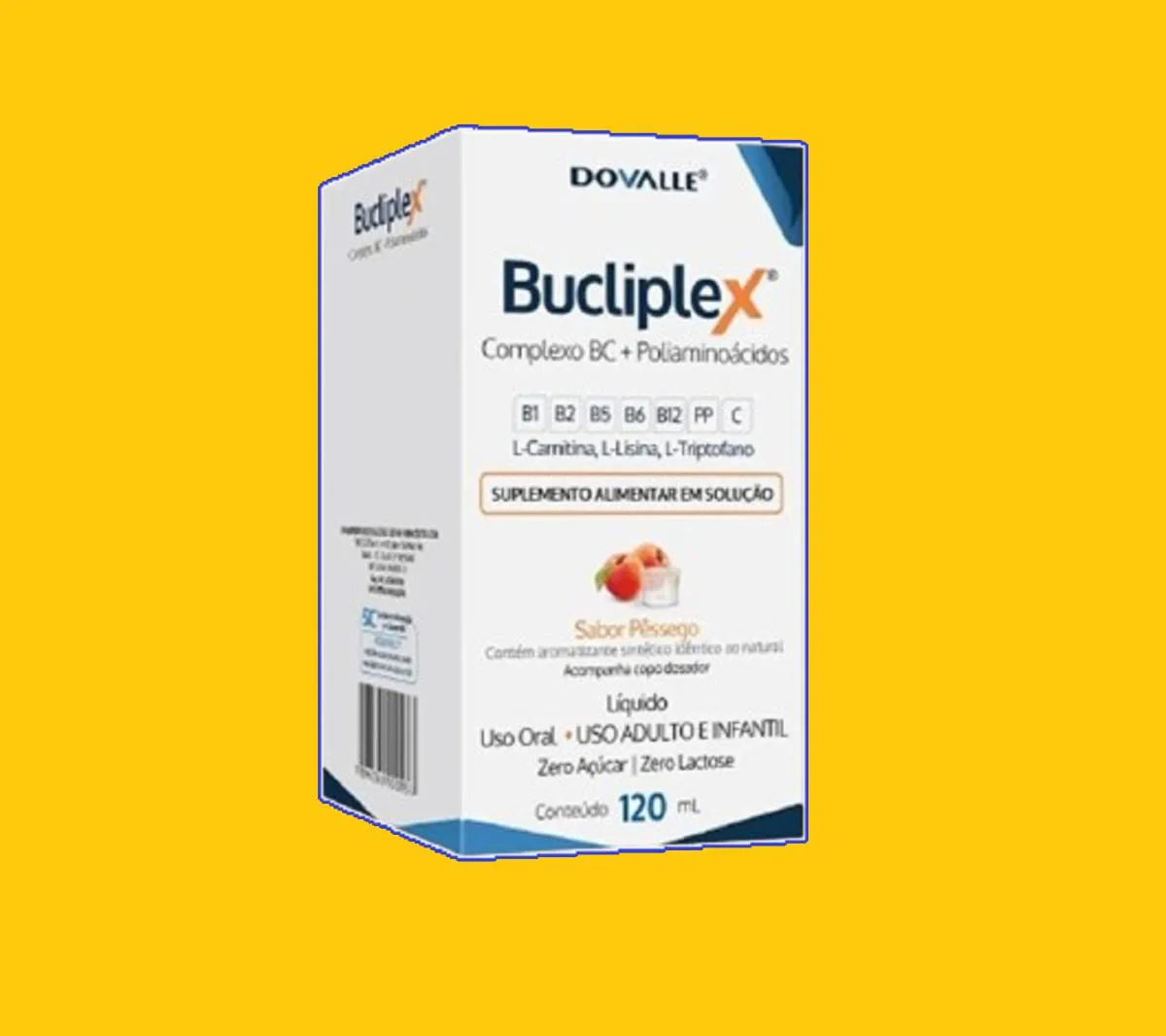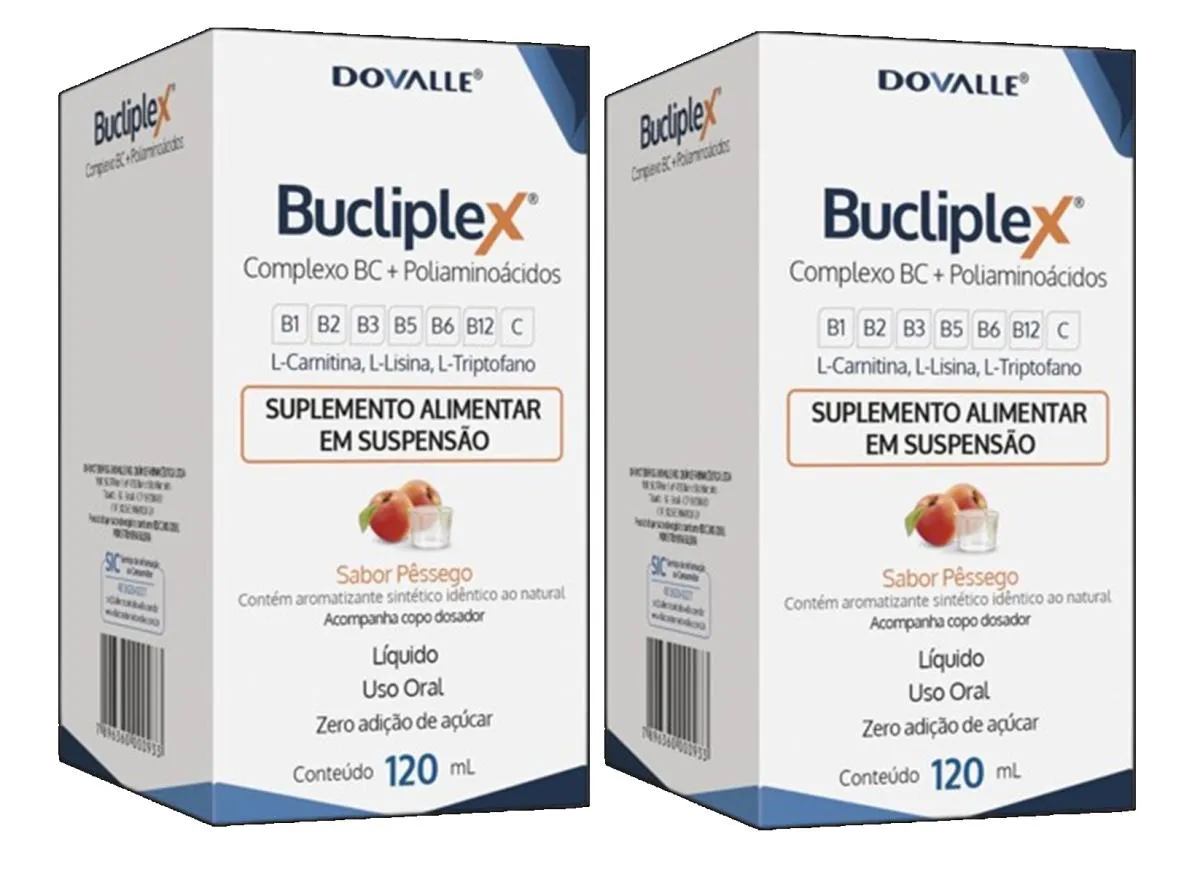 Kit 2 Suplemento Vitamínico Bucliplex Solução 120ml - Dovalle Suplemento líquido com vitaminas do complexo B, vitamina c e aminoácidos como L-carnitina, L-lisina e L-triptofano. Fórmula com sabor pêssego, livre de glúten, lactose e açúcar. Imagens Meramente Ilustrativas. Todas as Informações Divulgadas são de Responsabilidade Exclusiva do Fabricante/fornecedor.