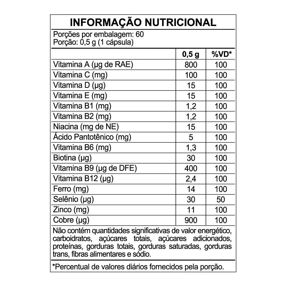 Suplemento vitamínico e mineral completo, com formulação de A a Zinco, ideal para o fortalecimento geral do organismo.
